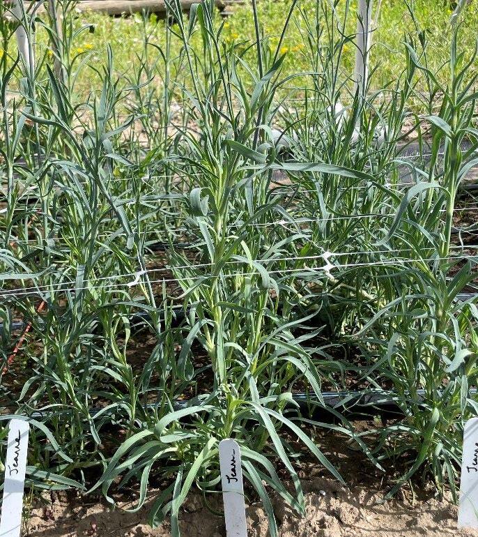 A horizontal trellis (also known as netting) is recommended to reinforce plants and promote straight, marketable stems, especially in high-wind locations. Carnation stems can be wispy and delicate and may topple under the weight of the flower heads. Under ideal field conditions, carnation can reach up to 40 inches tall, and mesh trellis (6-by-6-inch) pulled taut across the bed is the most effective support (Figure 3) Trellis is easiest to install before or right after planting and can also serve as a planting grid. Installing when the plants are taller is cumbersome and can damage the stems. Two methods for staking the trellis can be implemented. If shade or low tunnels are used, the hoops can support the trellis across the row. See USU Extension’s “Low Tunnels for Field Cut Flower Production” fact sheet for more information. Alternatively, wooden stakes or rebar can be installed at 3- to 5-foot intervals along the bed edge. Move the trellis upward as the plants grow to match half the height of the tallest stems.