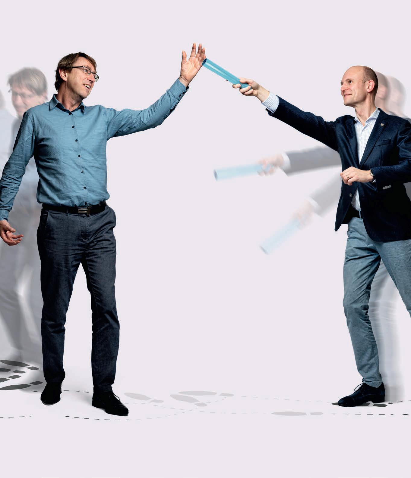 6. Geef de estafettestok door aan een collega waar jij benieuwd naar bent en graag een kop koffie mee wil drinken. •