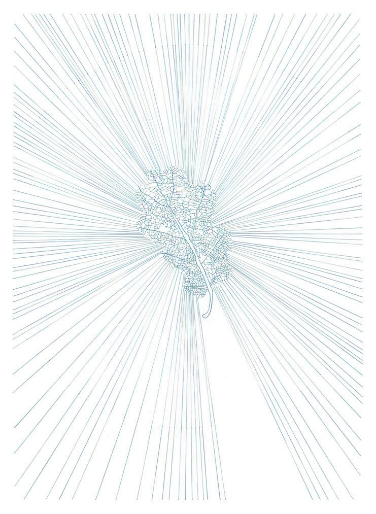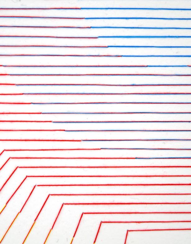 The power of shining metal is in absolute contrast to humble subtlety of sewing thread. Stillman has used thread since earliest days, first learning to sew and make patterns at her mother’s side, and then in an art context to make ‘drawings’ on paper and in space at art school. But in recent years she has been making drawings on paper by piercing tiny holes on art paper and then sewing thread through the holes to create her images. Her drawings have been about process and instruction but in this exhibition they are more layered and ambiguous, and as she says, ‘sometimes the thread structures seem to be supporting the paper, rather than the paper supporting them’.