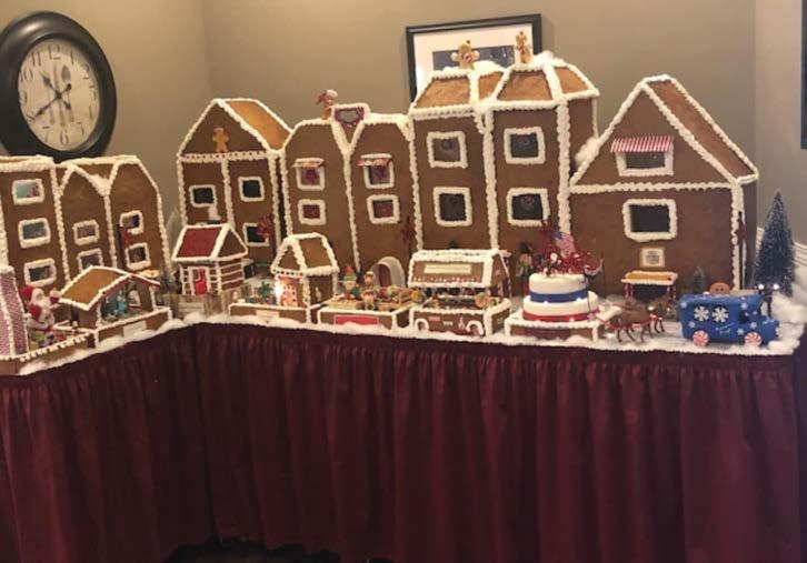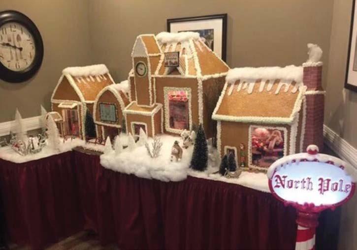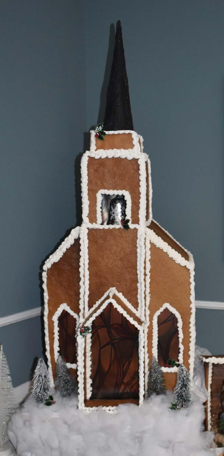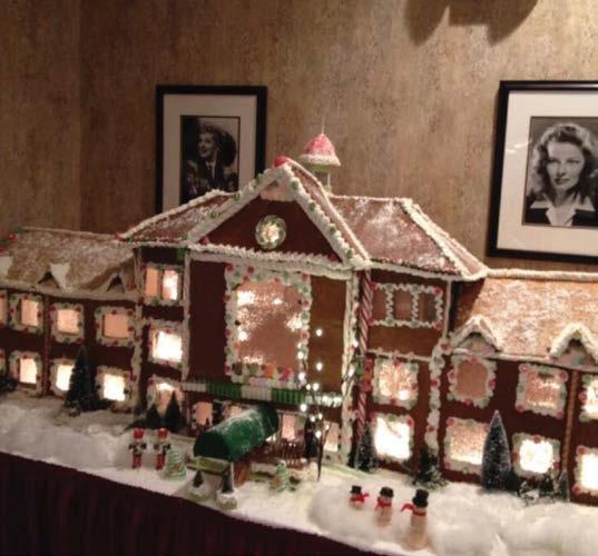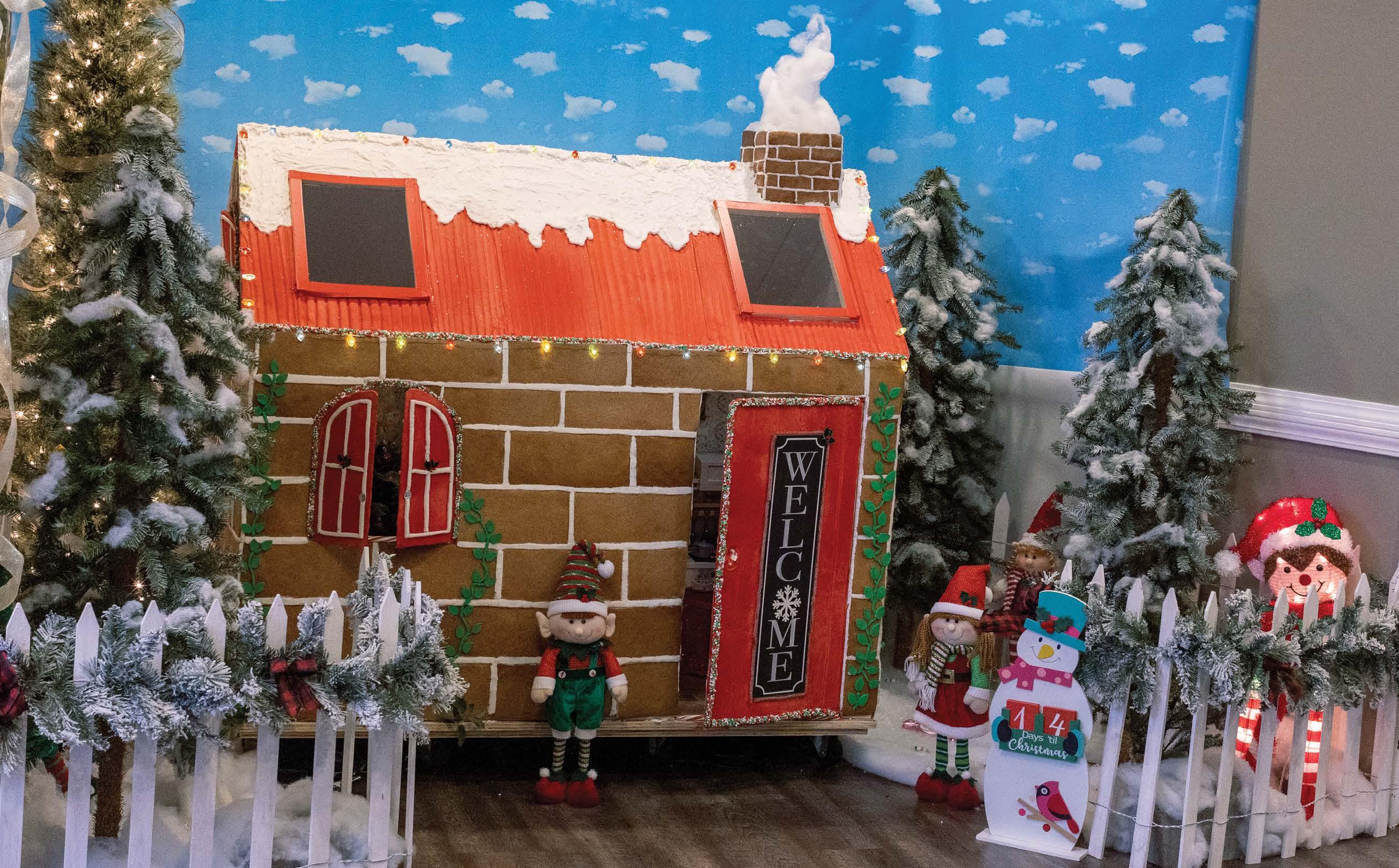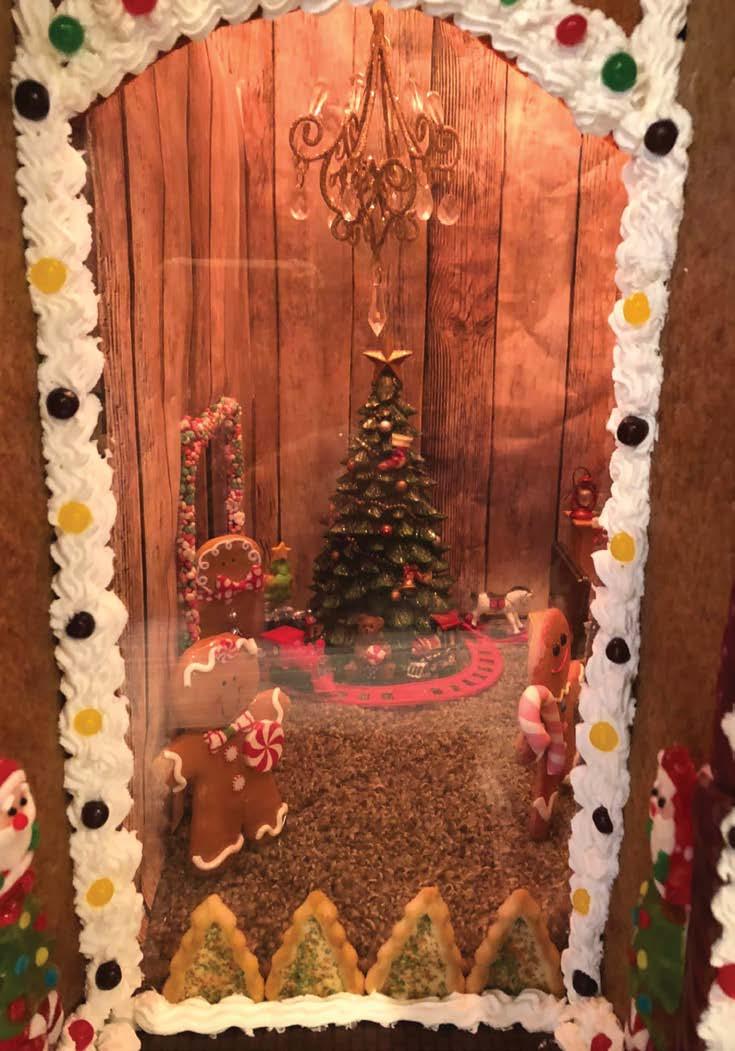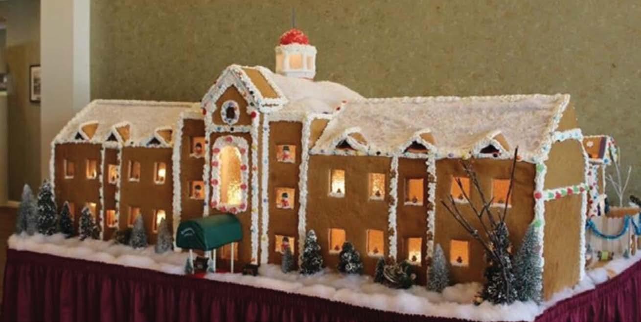 STOCKINGS ARE HUNG ON THE WALL, each table features a beautiful centerpiece, bouncing light at Christmas cheer across the room. But before one can even reach the tables, the main attraction amidst all the other holiday décor is an edible masterpiece that has become an annual tradition, a massive gingerbread house where adorable elves reside. This elf wonderland sits at the entrance to the dining hall, complete with skylights that allow passersby the opportunity to peer in and see what the residents are up to.