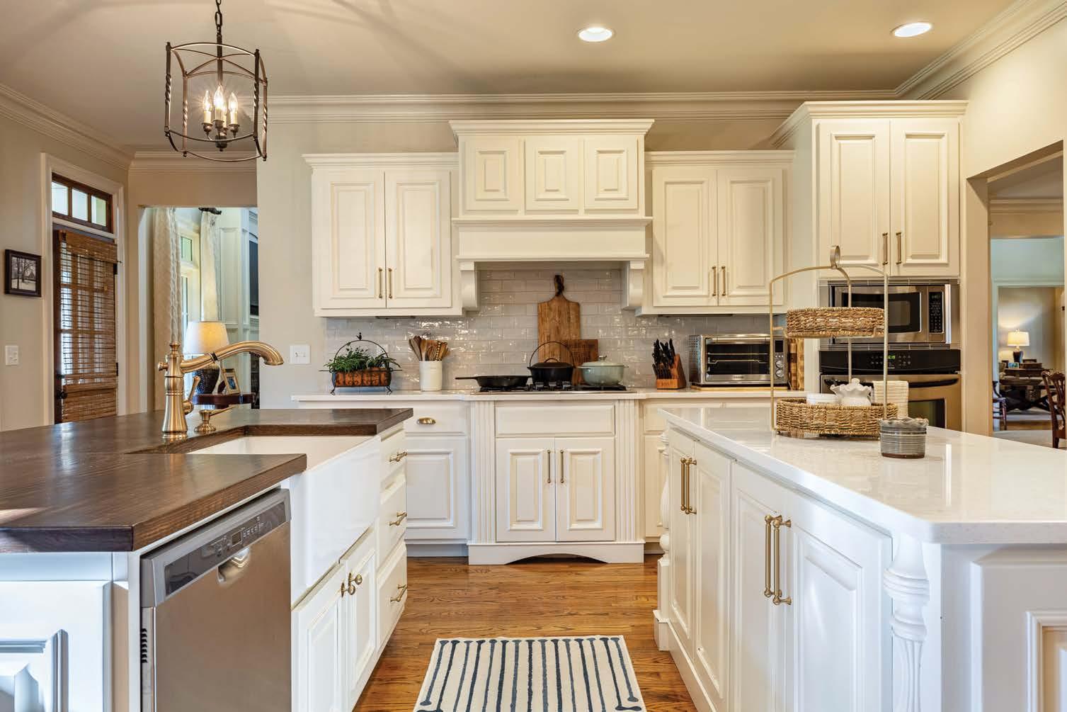 If you love hosting, this home has been designed with you in mind. “This is an entertainer’s home,” says Hunt. The expansive kitchen, with its modern appliances and ample counter space, is perfect for preparing gourmet meals for large gatherings. “The kitchen underwent an extensive remodel in 2020,” says Hunt, complete with new white cabinetry, beautiful handles and knobs with a gold finish, quartz and wood countertops, all new stainless-steel appliances, and a classic subwaystyle backsplash. This is a kitchen meant for cooking dinner for friends and making everything from scratch with the kids, whether it is pizza dough, bake sale goodies, or memories.