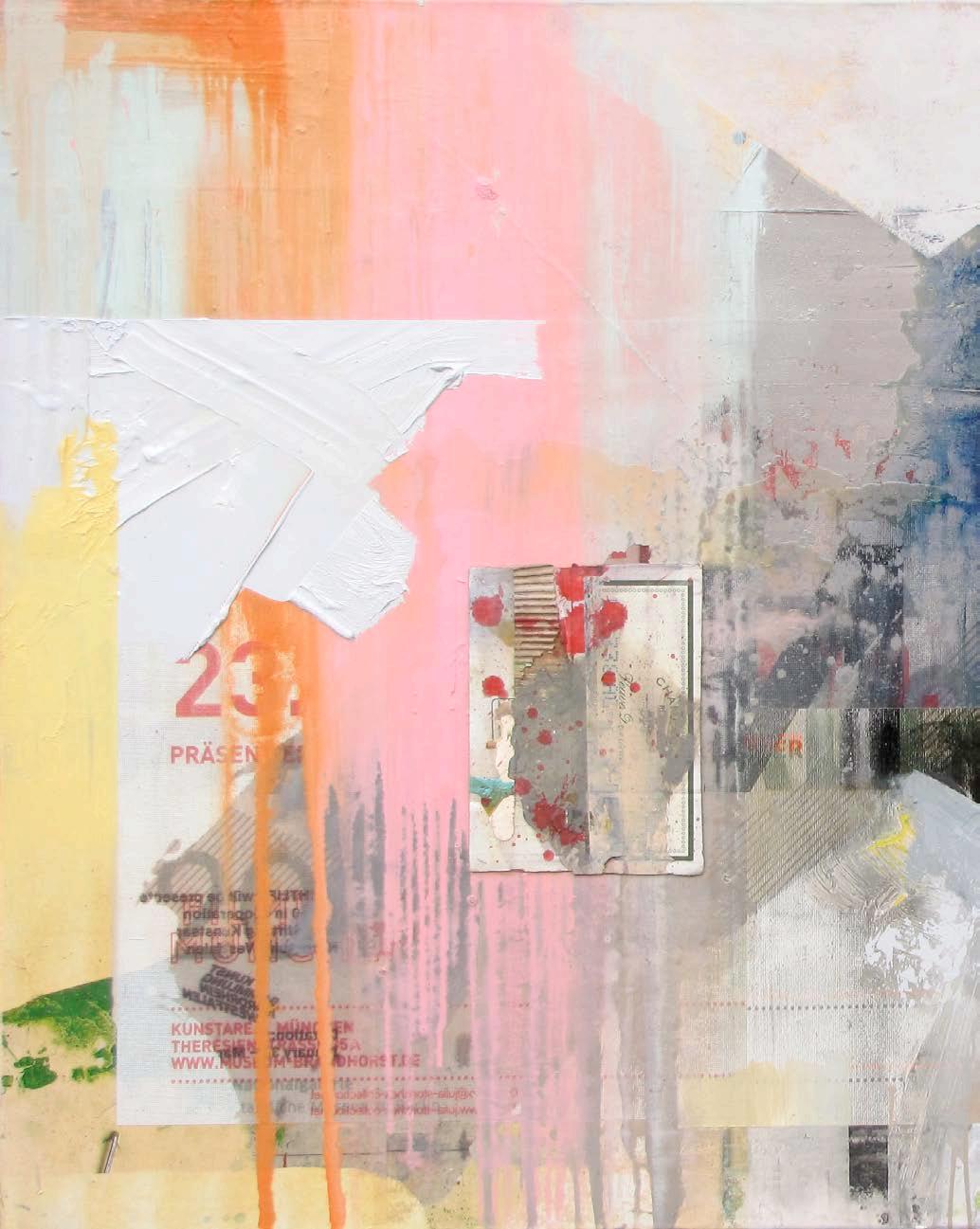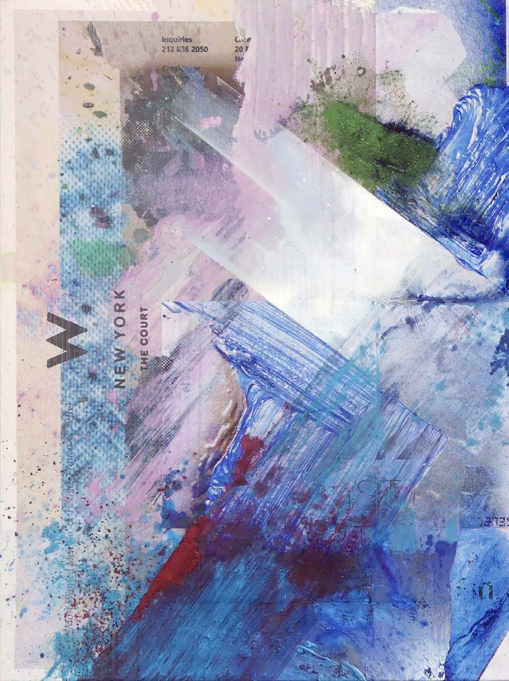 Versatzstücke des Kommerzes, derer er sich bedient, stammen nun aber bevorzugt aus einzelnen Hotels oder sind, genauer gesagt, von ihnen inspiriert und zeugen von Reisen, die Vahlefeld unternommen hat. Er benutzt die etablierte Farb- und Formensprache von Hotels, um sie in seine Bilder zu integrieren oder mit anderen Versatzstücken zu sampeln und zu mixen. Mal offensichtlich, mal dezent, mal physisch, mal digitalisiert tauchen Teile von Design- und Funktionsobjekten dieser Hotels in seinen Bildern auf: charakteristische Stoffe von Gardinen oder Polstern, wie sie dort verwendet werden, mehrere Buchstaben oder ganze Textauszüge im Corporate Design des Hotels, ob aus Teilen einer Barquittung oder eines Kofferanhängers, eines Feedbackformulars für Gäste oder aus den Adressangaben im Hotelbriefkopf. Soviel zur Preisfrage, woraus die Bilder bestehen.