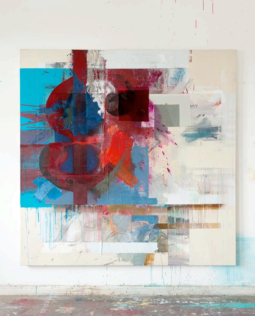 Vahlefeld schreitet zunächst auf dem gestalterischen Weg fort, den er schon mit früheren Bildern beschritten hat: Er trägt Material auf und trägt es an einigen Stellen wieder ab, er be- und übermalt mit