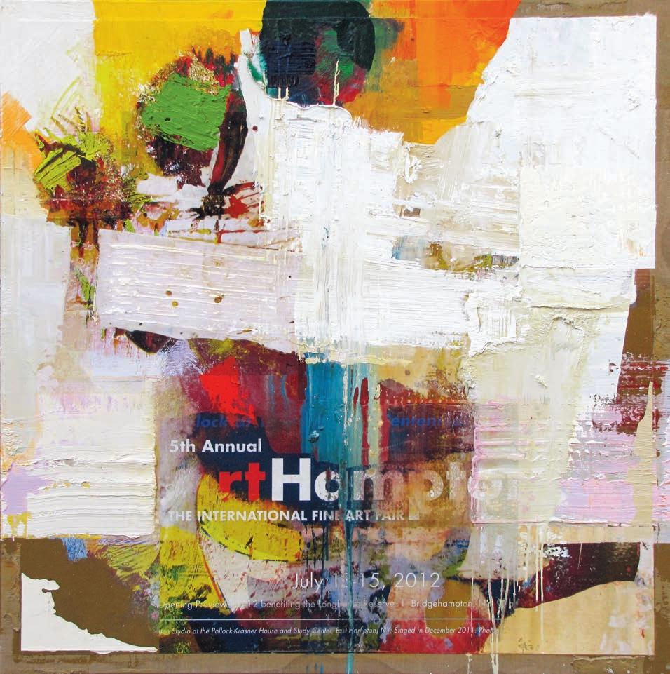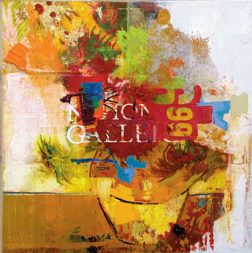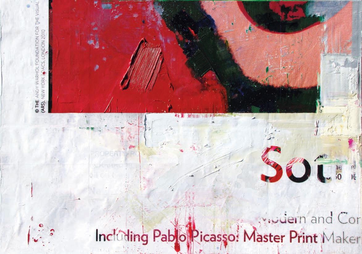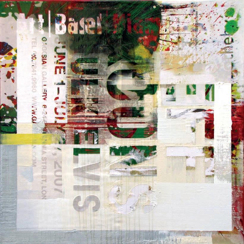 media and advertising. Do we accept mass media at face value, or do we view the world through coloured glasses? The history of art is being constantly rewritten according to the demands of the present, piecing fragments of the old together to form a visual language, which resonates with the contemporary consumer. Nothing coheres in a way that could be said to have substantive narrative dimension or pictorial legibility, except for visible stops and starts that prod the limits of content. We read snippets like »Hermitage«, »Museo del Prado«, »Chardin«, »Von Matisse zum Blauen Reiter«, etc. Other words are fragmented or superimposed to the point of eligibility. Traces of subtractions—the scraping off of layers of pigment—are as central to his process-based works as the scratchy lines of the sanding machine or the iridescent staining with heavy oil paint by the broom.