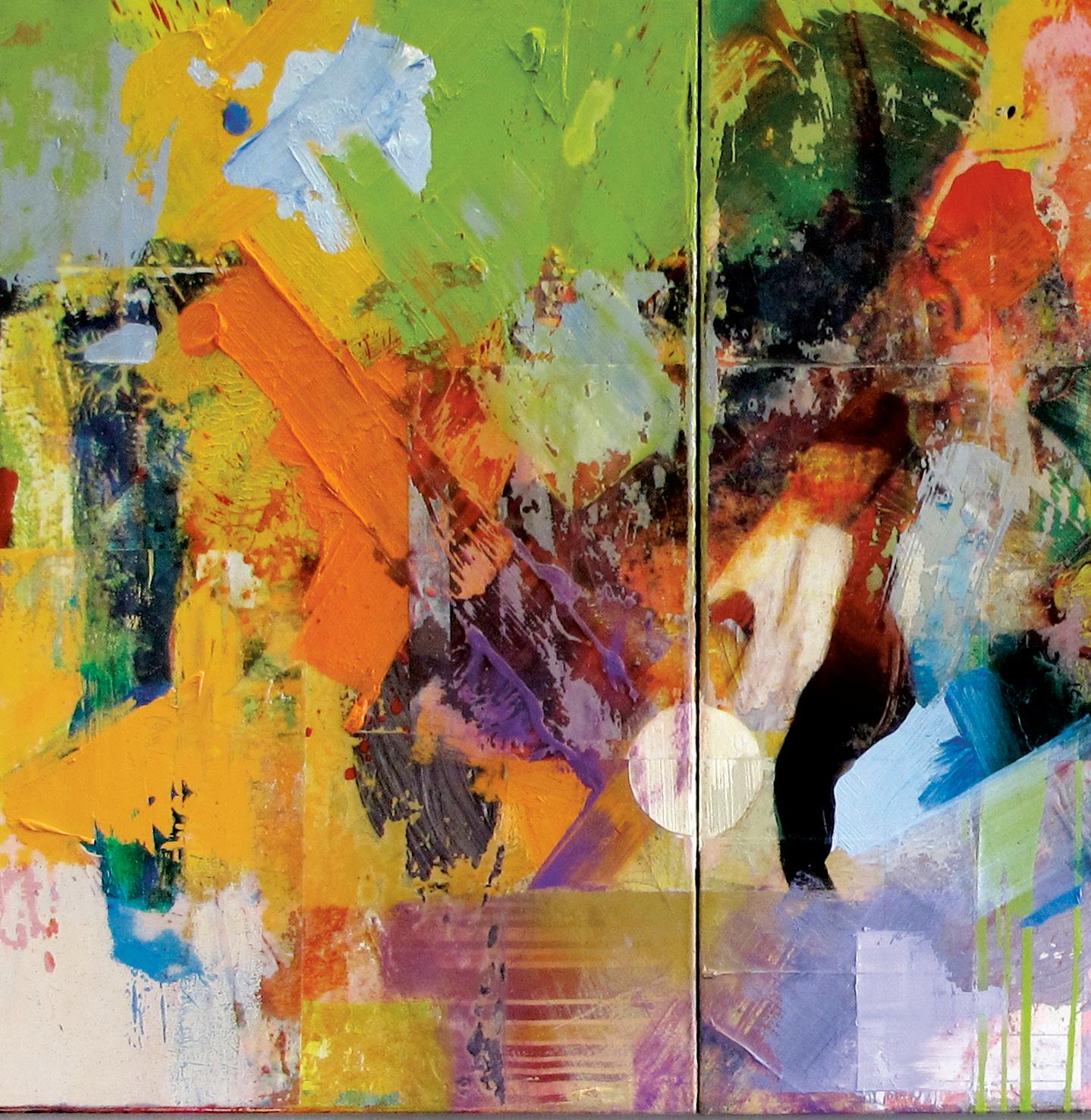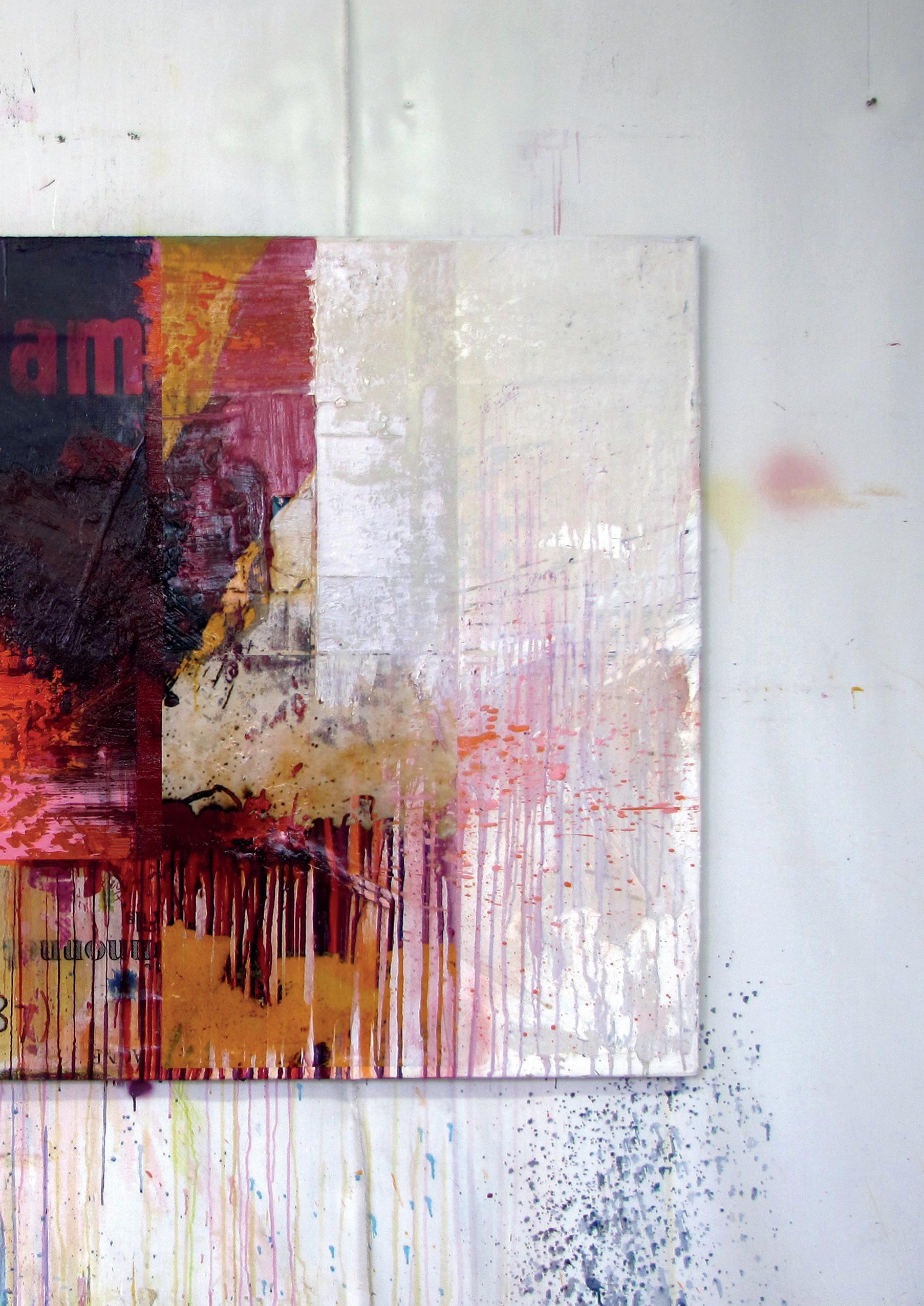 Mitteln versteht. Seine Medien sind Inkjet-Drucke mit pigmentierten Tinten im Dialog mit Acryl- und Ölfarbe. Das Material wird, anders als im Rechner dessen Funktionslogik auf beschriebenen Regeln basiert, selbst zum Thema als Folge von Aktionen. Geschüttete Farbpartien und markante Gesten, treffen mal auf ein digitalen Ausdruck, mal auf farblichen Stoff oder echte Farbe. Mit Pinsel, Rakel, Roller, Schablonen, Schleifgeräten und anderen mechanischen Hilfsmitteln wird gestört oder neu aufgebaut, bis die so gesetzten Akzente das Bildgefüge überraschen oder irritieren.