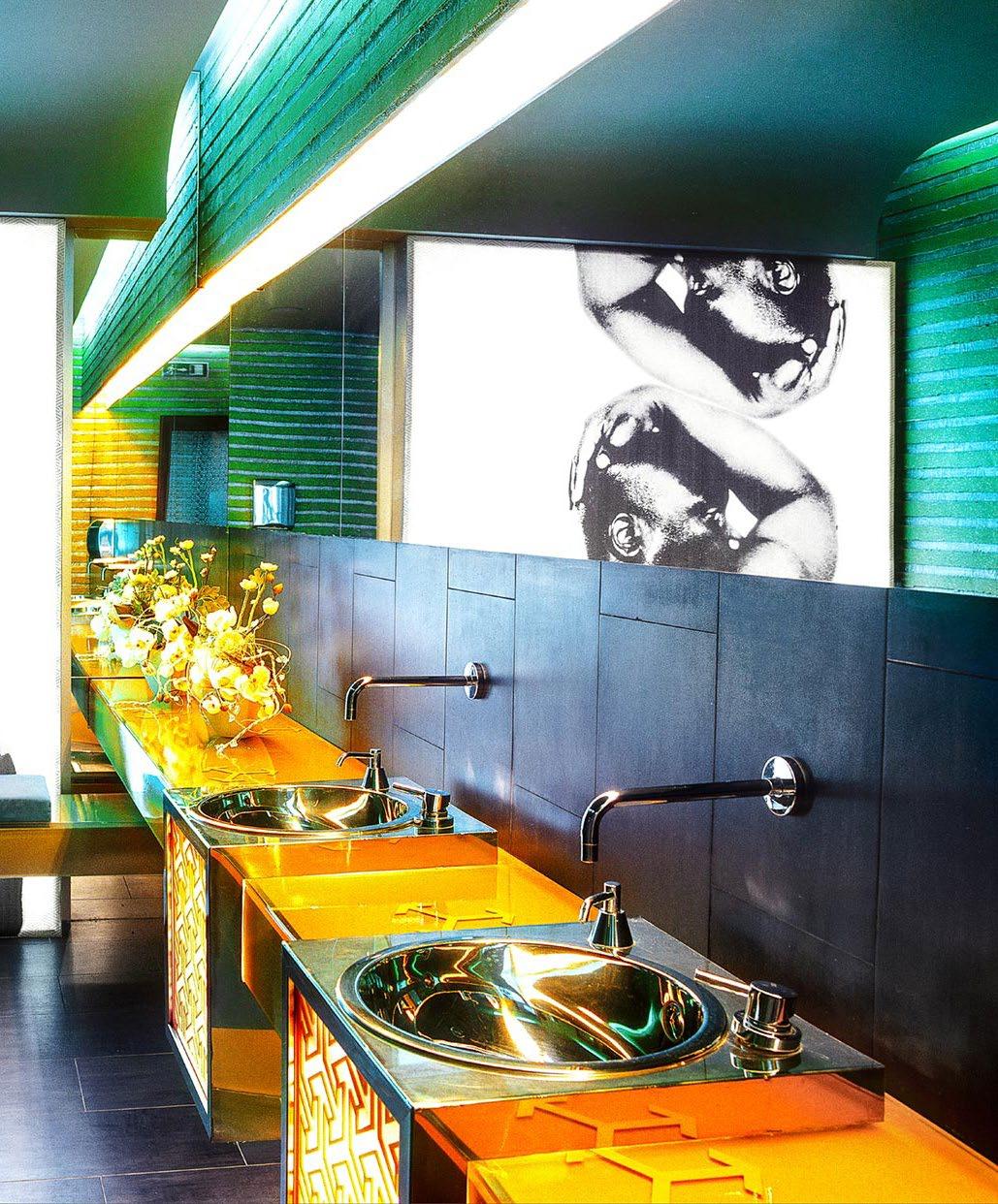The top of the table and the bench in the woman’s restroom are executed in the transparent plastic with the golden base.