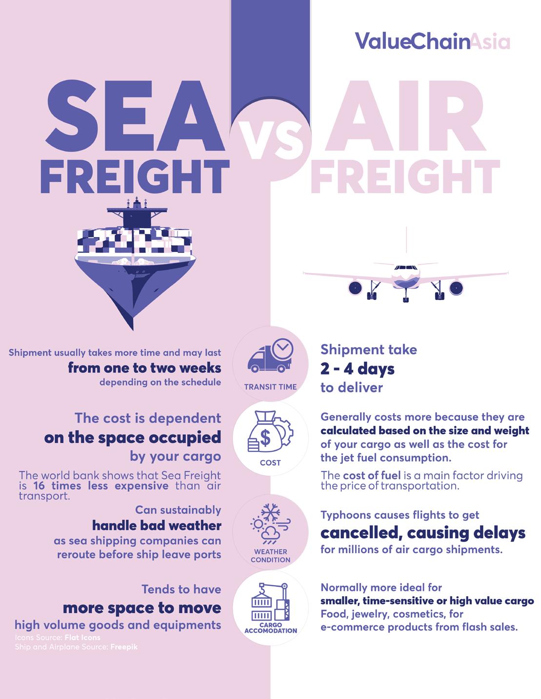 This is because the space available for cargo for airfreight is different versus seafreight. For larger size cargo, sometimes seafreight is the only option as the large shipment can only be carried in transport containers which goes on ships but not planes. While air freight can utilize both dedicated freighters and passenger flights, freighters are less widely available and do not cover all routes or origin-destination pairs, limiting their accessibility.