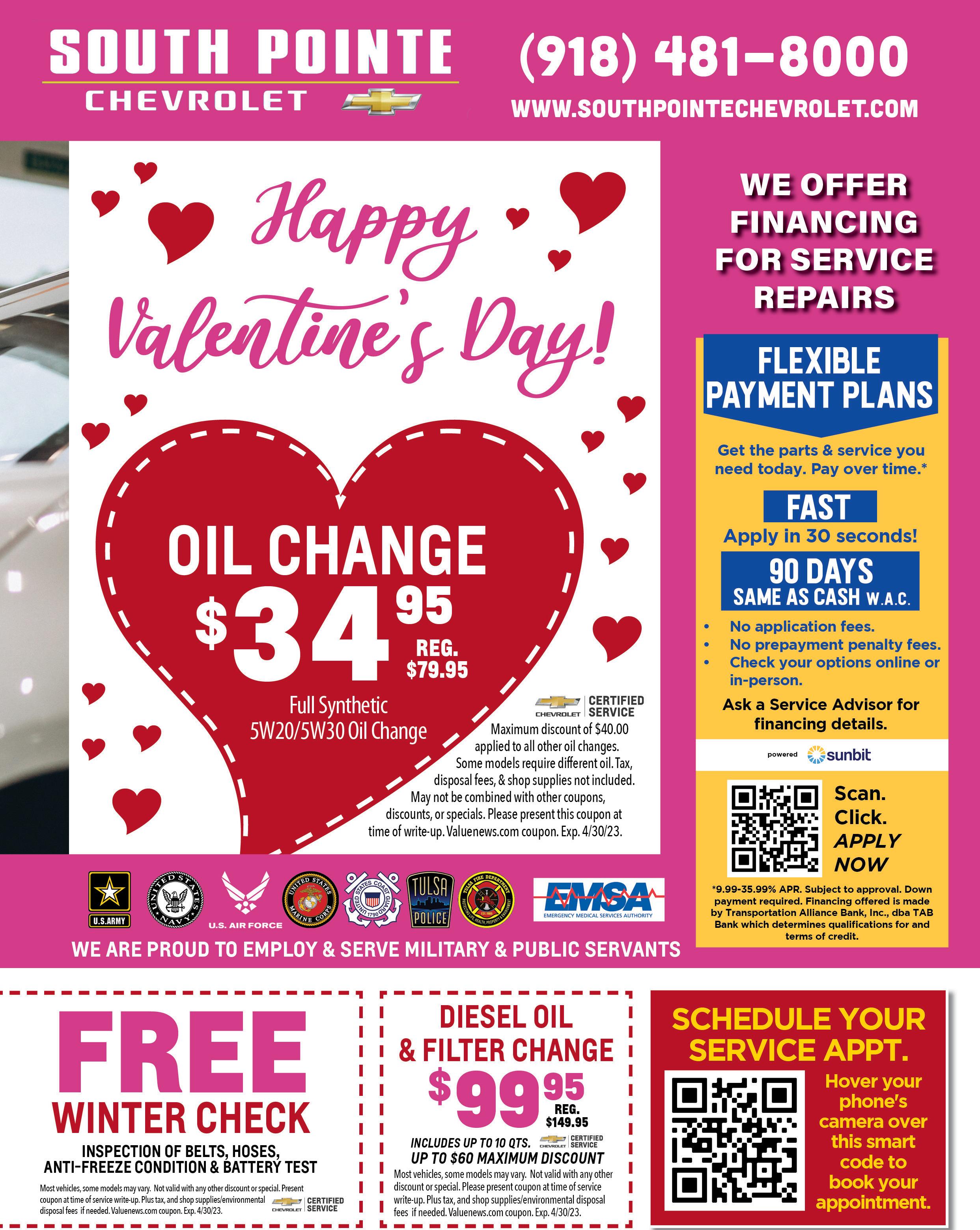 | Valid only at South Pointe Honda • 91st & Memorial • 918-496-7833 0W20 Full Synthetic Includes: - Replacing engine oil per specifications (up to 5 quarts) - Assessing/adjusting fluid levels - Complimentary multi-point inspection $3995 OIL CHANGE WITH MULTI-POINT INSPECTION Valid only at South Pointe Honda • 91st & Memorial • 918-496-7833 - Replace front or rear pads with Genuine Honda brake pads - Inspect discs/calipers/lines/hoses/cylinders/master cylinder* $12995 FRONT OR REAR BRAKE SPECIAL Valid only at South Pointe Honda 91st & Memorial • 918-496-7833 - Adjust caster, camber & toe-in as needed - Check suspension, steering linkage & steering rack preload - Inspect wheels & tires - Adjust tie rods as needed to center steering wheel - Road test $7995 ALL-WHEEL ALIGNMENT Valid only at South Pointe Honda • 91st & Memorial • 918-496-7833 10% off any service or repairs. You choose what service or repair to use this coupon for Use this Wild Card Coupon to fit your needs. 10% OFF WILD CARD COUPON Valid only at South Pointe Honda • 91st & Memorial • 918-496-7833 For optimal performance, gas mileage and safety, choose Honda Authorized Tires from your Honda dealer. Right now, purchase 4 tires for the price of 3. Free tire rotations, tire balancing, and flat repairs for the life of the tires. BUY 4 TIRES FOR THE PRICE OF 3! MOBILE FRIENDLY COUPONS SOUTH POINTE HONDA SERVICE SAVINGS Easy Steps: 1. ValueNews.com 2. Tap ‘Coupons & Deals’ 3. Tap ‘South Pointe Honda’ SCHEDULE YOUR SERVICE APPOINTMENT Hover your phone’s camera over this smart code to book your appointment. Valid only at South Pointe Honda 91st & Memorial • 918-496-7833 Make sure your vehicle is ready for the winter temperatures. We will perform a coolant/antifreeze service on your vehicle to ensure that your vehicle is ready for the winter temperatures. We use only Honda Genuine Coolant. $8995 HONDA GENUINE COOLANT/ ANTIFREEZE SERVICE Scan. Click. APPLY NOW! Flexible Payment Plans W.A.C WITH ANY REGULAR SUB PURCHASE & BUY 1 REGULAR SUB, GET 2ND REGULAR SUB OF EQUAL OR LESSER VALUE FREE!