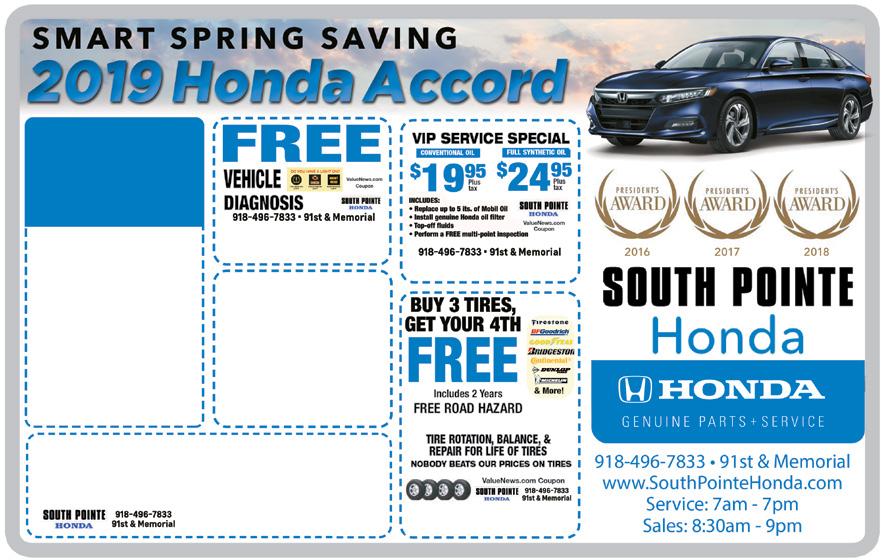 (918) 481-8000 www.southpointechevrolet.com INSPECTION OF BELTS, HOSES, ANTI-FREE ZE CONDITION & BAT TERY TEST FREE WINTER CHECK UP TO $60 MAXIMUM DISCOUNT INCLUDES UP TO 10 QTS. REG. $149.95 DIESEL OIL & FILTER CHANGE $9995 REG. $79.95 OIL CHANGE $34 95 Full Synthetic 5W20/5W30 Oil Change WE ARE PROUD TO EMPLOY & SERVE MILITARY & PUBLIC SERVANTS 90 DAYS SAME AS CASH W.A.C. flexible payment plans fast (918) 828-9600 VALUENEWS.COM JANUARY 2023 VALUE NEWS | 3