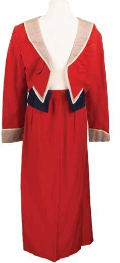 A costume from “There’s No Business Like Show Business” worn by screen legend Ethel Merman playing Molly Donahue. At 16:24 into the film, Merman wears this jacket and skirt combo while reading a radio commercial for Shelby’s Coffee. The costume was designed by Miles White, also known for “Around the World in 80 Days” and “The Greatest Show on Earth.” Made of a cotton-poly blend with chiffon cuffs and collar, the jacket measures 17” shoulder-to-shoulder and 16” long, with the skirt having a 27” waist and 29” length. The costume is in very good condition, with some wear from use and age, especially to the chiffon which has turned off white over time. $500 - $700