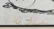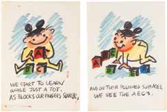 A “Progressive Mickey” cel from the Magic of Disney Animation Tour illustrating the main steps in the traditional animation process. Three drawings on the background show Mickey in rough, detail, and clean-up drawn stages, and the sericel features Mickey Mouse in the Xerographic and final painting steps. This piece comes with a two-page description of the process illustrated. The image measures 3” x 10.25” on a 10.5” x 13” cel which is in fine condition with some very minor smudges towards the top right. The 8.5” x 11” description is in good condition with some wear and spotting. $200 - $400