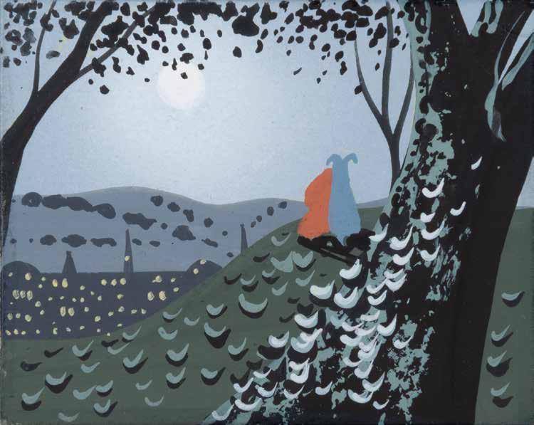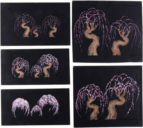 767. A Set of Tokyo Disneyland Concepts by Claude Coats. (Tokyo Disneyland, 1983) A set of five concept paintings by Animator and Imagineer Claude Coats for the Meet the World attraction at Tokyo Disneyland. Coats was the lead designer on the 19-minute attraction, which told the history of Japan through a rotating theater format. These five pieces depict sakura, also known as cherry blossom trees. Ranging in size from 7.25” x 13.7 to 12.75” x 14.25”, the concepts are in good condition with dark smudges, scratches, edge wear, and holes at the corners from production. $500 - $700