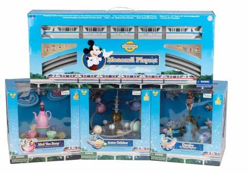 757. A Collection of Disney Parks Playsets. (Disneyland/Walt Disney World, 2000s) A collection of four Disneyland and Walt Disney World interactive playsets. Included are plastic recreations of Dumbo the Flying Elephant, Astro Orbiter, Mad Tea Party, and the blue Walt Disney World Monorail. The sets feature miniature figures of the Fab Five, Daisy Duck, Lilo, and Stitch. The sets require two AA batteries to work (not included), and some assembly is required. Still intact in their unopened original packaging ranging in size from 10.5” x 8.75” x 11” tall to 27” x 4.75” x 11.25” tall, the playsets appear to be in fine condition. $300 - $500