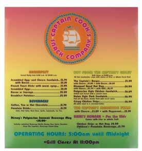 761. A Polynesian Resort Captain Cook’s Menu Sign. (Polynesian Resort, 1990s) An all-day menu sign for Captain Cook’s Snack Company at the Polynesian Resort. Measuring 28.5” x 26.5”, the sign is in very good used condition, with scuffing and scratching to the surface as expected from Resort display, and very slight peeling at corners to the backing. $300 - $500