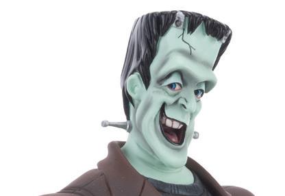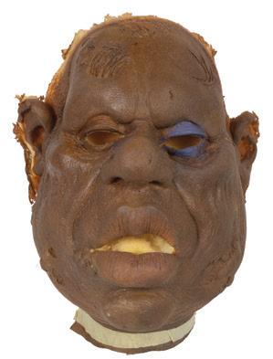 13. A Froggy the Gremlin Store Window Display Figure. (Buster Brown, 1950s) A Froggy the Gremlin store window display for Buster Brown Shoes. Froggy was a mischievous practical joker on the “Smilin’ Ed McConnell’s Buster Brown Gang” children’s radio show, sponsored by the shoe company. Accomplished in composite with two wooden supports in the back, Froggy measures 26” x 30.5” x 4” deep. The display is in good condition with light cracks to the base of the shoes, neck, and left cuff, light cracks with paint loss along the mouth and bottom edge where the legs meet the shoes, a 1.25” area of cracking with paint loss on the nose, and light soiling and spots of stains throughout.