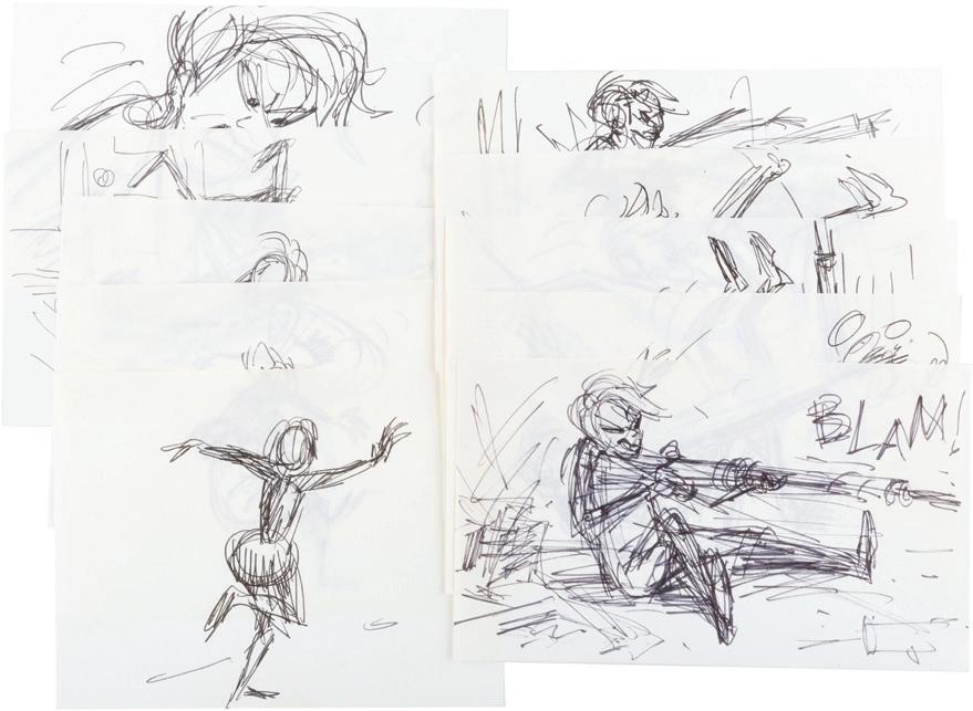 632. A Collection of The Predator Adventure Storyboards. (1990s-2000s) A collection of nine storyboards for a proposed attraction inspired by the “Predator” film franchise. Accomplished in graphite and marker, the storyboards for The Predator Adventure depict an attraction combining live-action actors, animatronic robots, and gaming elements. With image sizes ranging from 5.25” x 11.5” to 6” x 10.5” on vellum measuring up to 11” x 17”, the art is in good to very good condition with light creases, stains, edge tears, a large fold on one sheet, and discoloration from age. $300 - $500