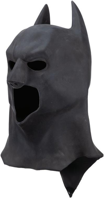 60. A “Batman Begins” Batsuit Stunt Cowl. (Warner Bros., 2005) A Batman costume cowl from Christopher Nolan’s “Batman Begins.” This rubber cowl was worn by the stunt double of Christian Bale during production and is labeled “stunt” inside. Measuring 9” x 11” x 21” tall, the cowl is in good condition with typical wear from production use, including stains and discoloration. $5,000 - $7,000
