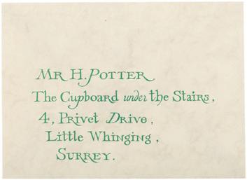 65. A Harry Potter Hogwarts Envelope Prop. (Warner Bros., 2001) A Hogwarts envelope prop from “Harry Potter and the Sorcerer’s Stone.” For the scene with hundreds of invitations flying down the chimney and around the Dursley’s living room, invitations, including this, were created with printed seals instead of wax to make them light and aerodynamic. Measuring 5.25” x 7.25”, the prop envelope is in very good condition with light wear from production use. $600 - $800