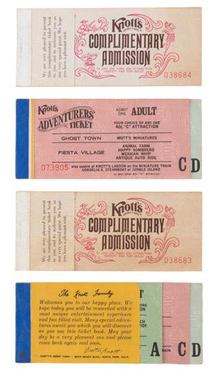 629. A Collection of Knott’s Berry Farm Ticket Books. (Knott’s Berry Farm, 1975-76) A collection of four ticket books from Knott’s Berry Farm. Included are two Complimentary Books and two Adventurers’ Club Books. These partially used ticket books originally belonged to Disney Legend Milt Albright and still retain one “A” ticket, six “C” tickets, and two “D” tickets. Measuring 2.5” x 6” each, the books are in good condition with creases, spots of discoloration, and wear from use. $300 - $500