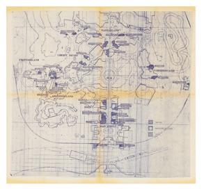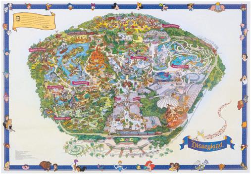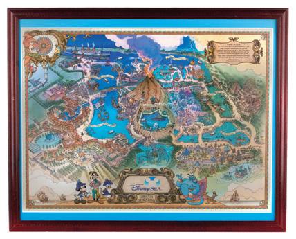630. A Six Flags Dubailand Map Concept Print. (Six Flags, 2008) A print of the map concept for the cancelled Six Flags Dubailand. The map was designed by former Imagineer James L. Michelson, who had illustrated posters for Jefferson Airplane, Buffalo Springfield, and The Monkees. Measuring 36” x 54.25”, the print displays in good condition with wear and heavy creasing to the edges and a 0.5” tear on the lower right edge, none of which affect the image.