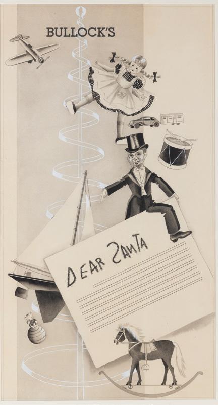 11. An Original Bullock’s Department Store “Dear Santa” Illustration. (Bullock’s, 1930s) An original promotional illustration displayed at Bullock’s department stores for the Holiday season. Bullock’s was a chain of department stores in Los Angeles, recognized for its elaborate Christmas displays, featuring large, decorated Christmas trees both on the roof and inside. The illustration is accomplished in watercolor and has a visible size of 12.25” x 22.5”. The entire matted framed piece measures 17.5” x 30”. The artwork is in fine condition with an area of adhesive residue to the top right corner of the glassless frame. $600 - $800