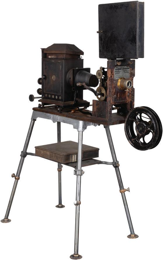 1. An Edison Projecting Kinetoscope. (Edison Manufacturing Company, 1897) An Improved Exhibition Model Edison Projecting Kinetoscope. Thomas Edison’s vision to “do for the eye what the phonograph does for the ear” led to the Kinetoscope, based largely on the work of his assistant William Dickson. To project 35mm film, the reel is loaded into the front box and runs through the gate, as powerful light from the lamphouse illuminates and enlarges the picture. This Kinetoscope includes a second original box for the film reel and a modern replacement handle. This vital piece of film history, bearing the serial number 12230, led to the modern projector and cinema as we know it. Measuring 48” x 23” x 61.5” tall, the kinetoscope is in good condition with heavy oxidation from age, scratches, scuffs, material loss, a crack in the handle, and wear from use. It is missing a transparency slide and rods to create the arclight. Due to size and weight, special shipping arrangements are required. Please inquire before bidding. $7,000 - $9,000