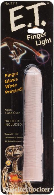 39. A Rare “E.T. the Extra-Terrestrial” Finger Light Toy. (Knickerbocker, 1982) A very rare “E.T. the Extra-Terrestrial” finger light toy by Knickerbocker. One of the most infamous movie tie-in toys for children, the rubber finger light’s unexpectedly suggestive design has made it a legendary item in the collectibles market. The toy’s light-up tip did not work when tested, likely requiring a new battery. Measuring 5.25” in its original 2.5” x 9.25” packaging, the toy is in fine condition, while the packaging displays in very good condition with light creases and a pricing adhesive on the reverse. $100 - $200