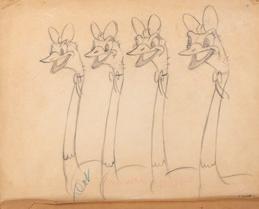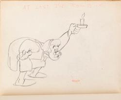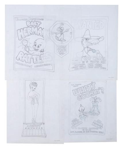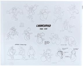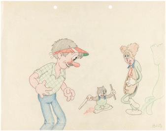 631. An Original Marc Davis Six Flags Character Concept Drawing. (Six Flags, 1984) A rare piece of original concept art for the Six Flags Power Plant in Baltimore Maryland, by Disney Legend Marc Davis. Conceived as a combination of entertainment, dining, and shopping area, Power Plant was part of an effort by Six Flags to diversify away from thrill-ride parks. Accomplished in ink and marker, this piece is one of many characters Davis designed for the Park. The image size measures 5.5” x 11.25” on 12” x 14” paper. The entire matte board mounted piece measures 16” x 18.75” with a protective sheet hinged at the top. The artwork is in fine condition with light wear and discoloration to the edges of the matte. $500 - $800