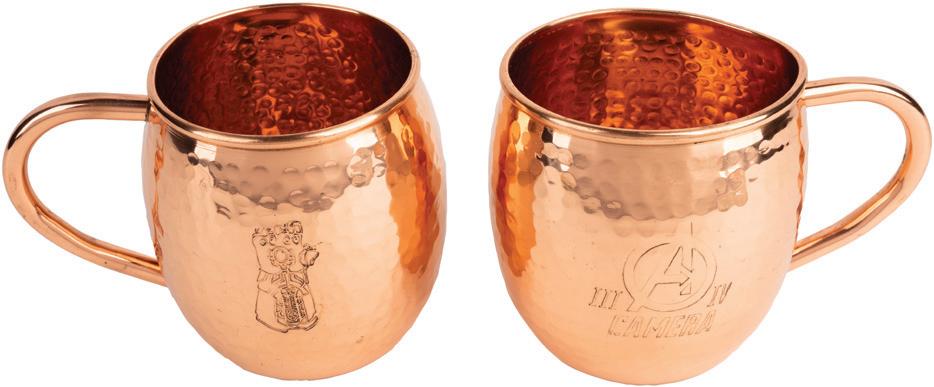 77. A Pair of “Avengers: Infinity War” and “Endgame” Crew Mugs. (Marvel, 2019) A pair of Moscow mule-style mugs created exclusively for the camera crew of “Avengers: Infinity War” and “Avengers: Endgame.” Featured on one side is the Avengers logo with “III,” “IV,” and “Camera,” while the other side features the Infinity Gauntlet used by Thanos. Measuring 4” tall and 3.25” in diameter each, the mugs are in very good to fine condition with light wear. $200 - $400