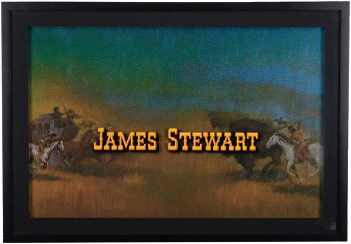 28. A James Stewart “How the West Was Won” Title Credit. (MGM, 1962) An original James Stewart opening title credit from “How the West Was Won.” Along with Jimmy Stewart, the star-studded cast included Henry Fonda, Karl Malden, Debbie Reynolds, and John Wayne. Although very similar to the screen-used credit, the production ultimately opted for an alternate version where Stewart’s first and last names were stacked. Accomplished in enamel on glass, the hand-painted title has been matted and framed with a color reproduction background. With an image size of 18.25” x 28.25” in a 23.25” x 33.5” frame, the piece is in very good condition with spots of paint loss, paint cracks, and scratches, while the frame displays in good condition with scratches, scuffs, and wear. This item requires special shipping arrangements. Please inquire before bidding. $1,000 - $2,000