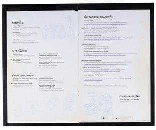 628. A Disney Cruise Line Animator’s Palate Menu. (Disney, 2011) A Dinnner Menu from the Animator’s Palate Restaurant on The Disney Wonder. This animation-themed restaurant featured on each of the four original Disney Cruise Line ships. The cover of the menu has a lenticular image of Mufasa and Baby Simba from “The Lion King.” Measuring 9” x 14.5”, the menu is in good condition with light edge wear, and spotting on the center page spread. $200 - $400