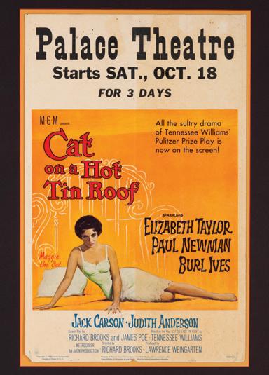 26. A “Cat on a Hot Tin Roof” Palace Theatre Window Card. (MGM, 1958) A window card promoting a three-day run of Elizabeth Taylor’s “Cat on a Hot Tin Roof” at the Palace Theatre in Los Angeles. Measuring 14” x 22” the window card displays in good condition with pinholes, staple holes, folds, spotting, creases, edge tears, discoloration from age, and water damage at the bottom right of the matte. $200 - $400