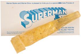 52. A “Superman” Film Series Prop and Preview Invitation. (Warner Bros., 1978/83) A Fortress of Solitude control panel crystal prop from Richard Donner’s “Superman,” and a preview invitation screening from “Superman III” at the Highland Park Village Theatre. Measuring 8” x 1.5” x 1.5”, the resin crystal is in good, production-used condition with heavy discoloration from age. The invitation measures 4” x 9” and displays in good condition with light edge wear, creases, and stains. $300 - $500