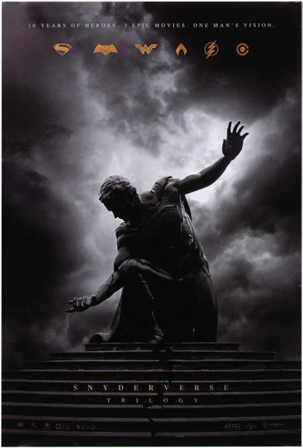 49. A Rare Snyderverse Trilogy Poster. (Warner Bros., 2023) A rare poster for a special screening of director Zack Snyder’s DC superhero trilogy, exclusively available to attendees. From April 28 to 30, 2023, three exclusive screenings were held in Los Angeles for “Man of Steel,” the extended ultimate edition of “Batman v. Superman: Dawn of Justice,” and the highly anticipated Snyder Cut of “Justice League.” Measuring 27” x 40”, the poster is in very good condition with light scratches and creases. $100 - $200