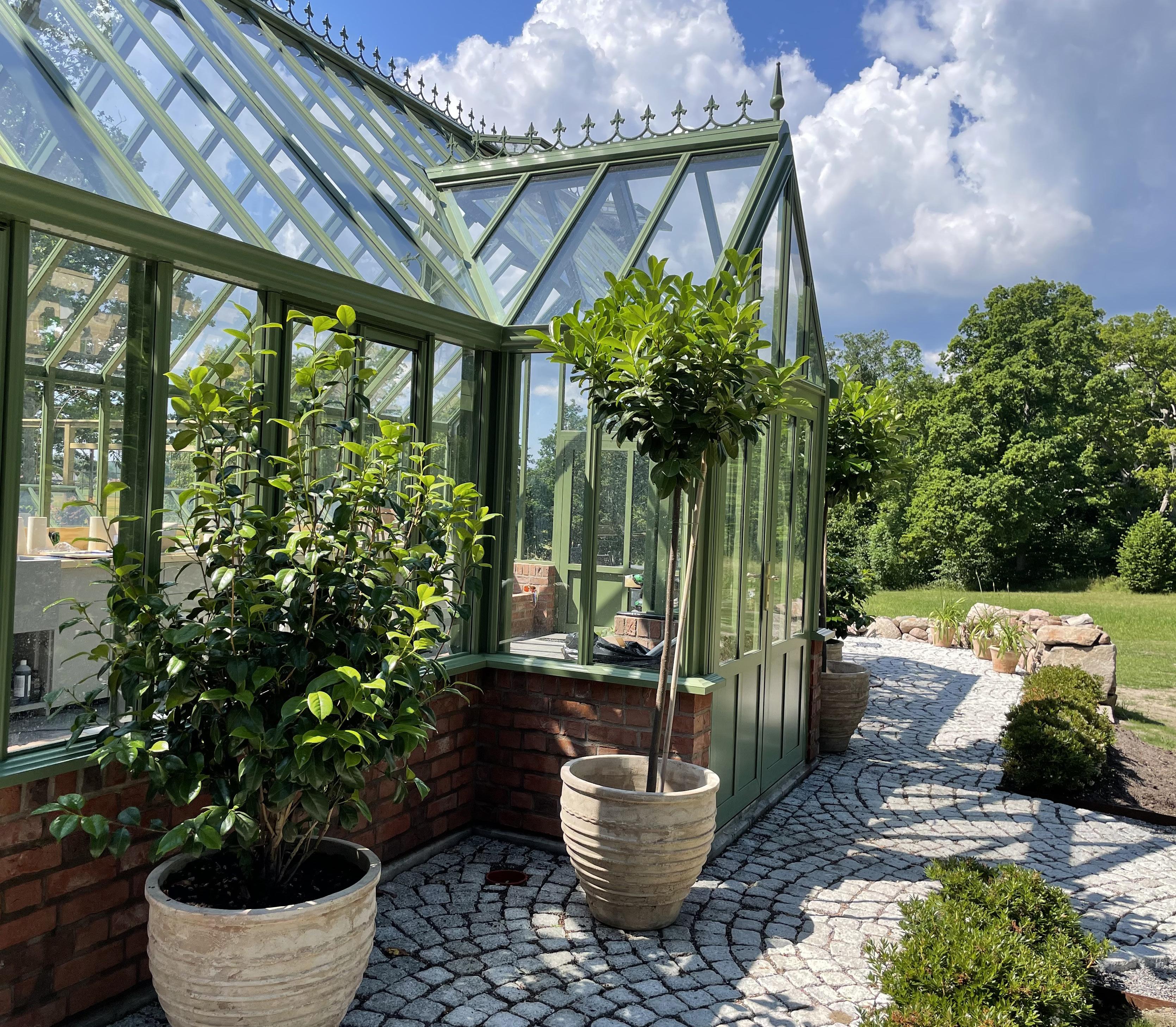 Nasz największy standardowy model o powierzchni około 40m2. Przy atrakcyjnej szerokości budynku 9, 5 metra możesz stworzyć różne strefy klimatyczne dla swoich upraw. W razie potrzeby możemy podzielić powierzchnię wewnętrzną ścianą. Zaprojektowanie wnętrza nie stanowi problemu – jest tu miejsce na wszystko. Raz jeszcze zbudowaliśmy oranżerię ogrodową o czysto klasycznych proporcjach - prawdziwe cacko dla kogoś, kto ma wystarczająco dużo miejsca.