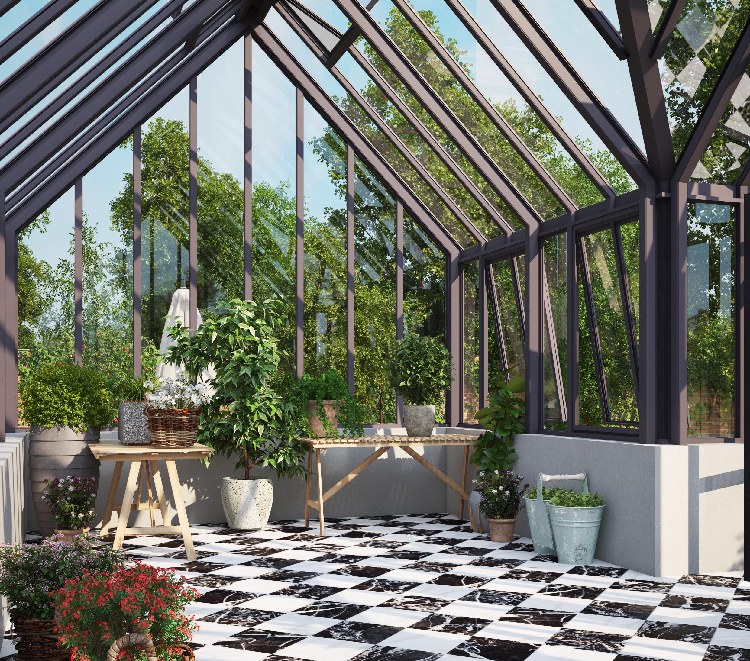 Wielkość tej oranżerii pozwala na fachową uprawę roślin, zmieści się duży stół na posiłki z rodziną i przyjaciółmi oraz wygodny stół roboczy.