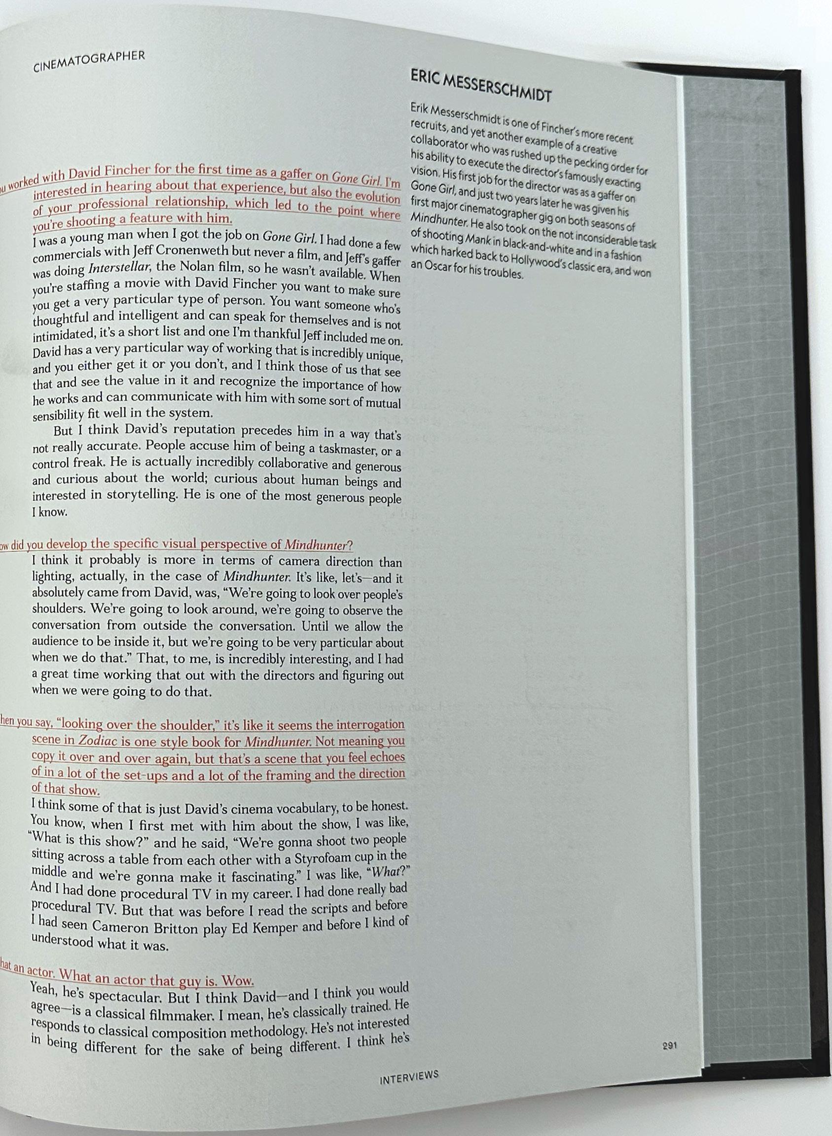 the scenes photography, still-frames, and original illustrations from Little White Lies’ international team of artists and graphic designers. Mind Games also features interviews with Fincher’s frequent collaborators, including Jeff Cronenweth, Angus Wall, Laray Mayfield, Holt McCallany, Howard Shore and Erik Messerschmidt.