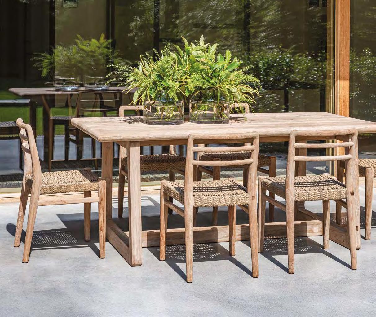 JOAN OUTDOOR WICKER AND RECLAIMED TEAK STACKABLE DINING ARMCHAIRS WITH DONALD OUTDOOR RECLAIMED TEAK TABLE