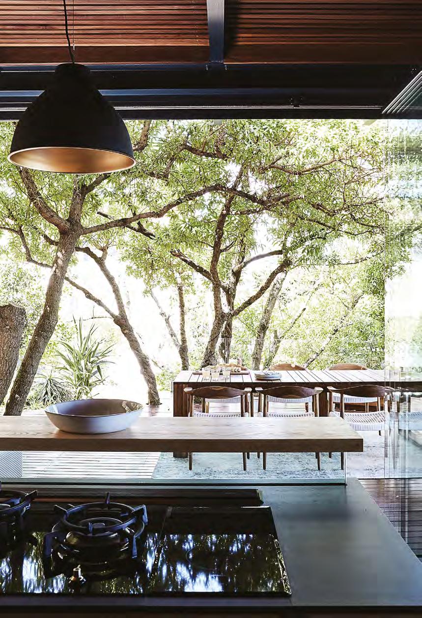 Right : Glass walls fold away to dissolve the boundaries between the hightech yet low-key kitchen area and the outdoor dining room. The kitchen featuring a central cooking island clad in Neolith with swivel stools provide a comfy perch.