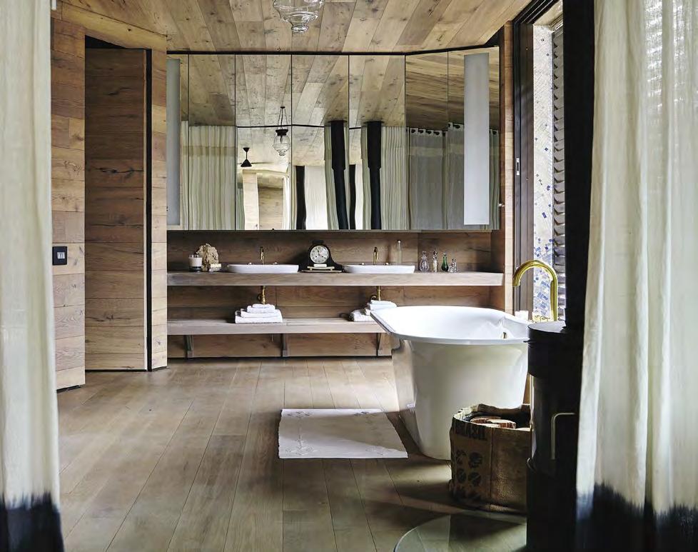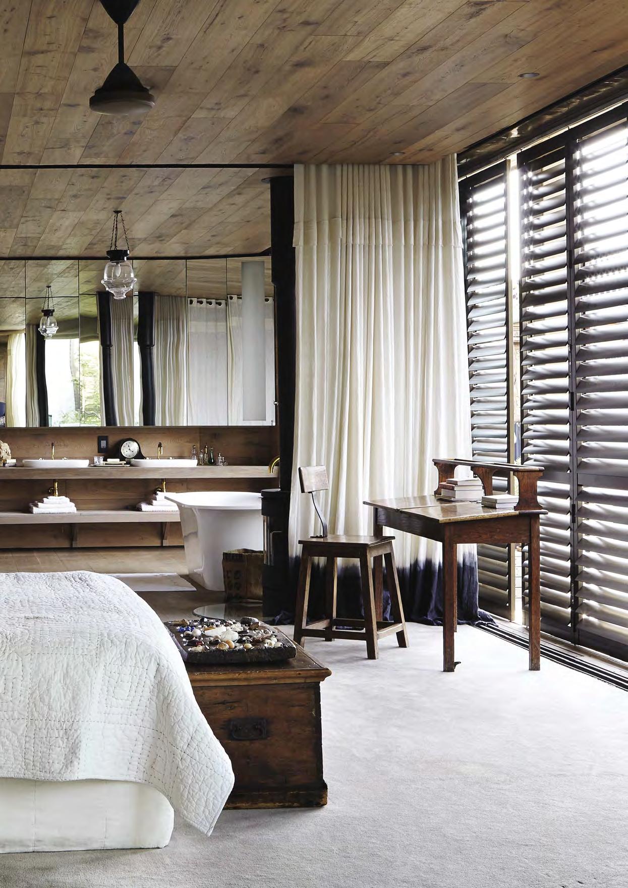 The main bathroom is a neutral cocoon of wood and white, with its own woodburning stove for chilly winter nights. Shuttered stacking doors close off the floor-to-ceiling windows for privacy when necessary, but opening onto a deck with an outdoor shower that “tiptoes” between the vaulted skylights of the gallery below. Carved Indian window frames screen the shower.