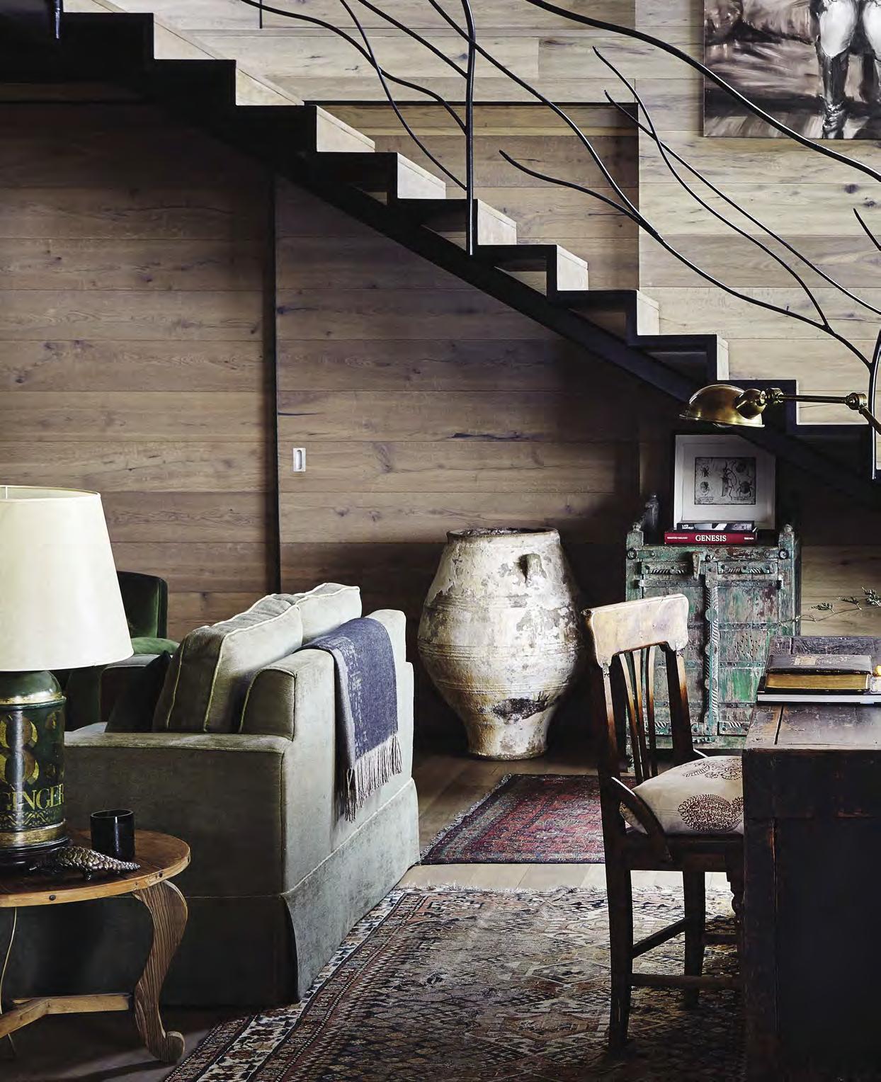 A delicate steel staircase against the wall has a balustrade inspired by willow branches. The furnishings are an eclectic