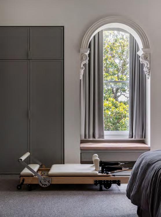 The main en suite bedroom at the end of the apartment is plush and carpeted. Instead of built-in cupboard doors, Christine opted for linen curtains, which soften the edges of the room and also screen off the bathroom area.