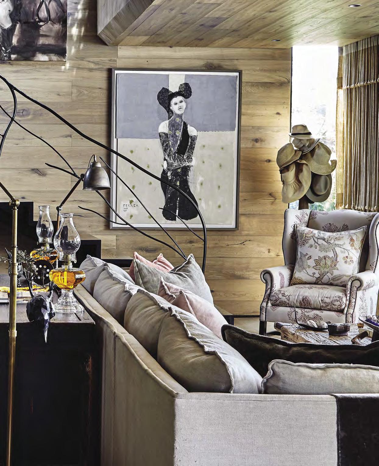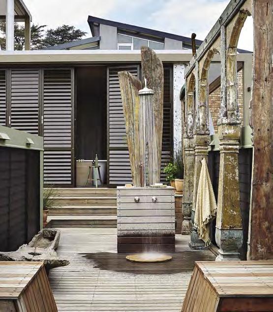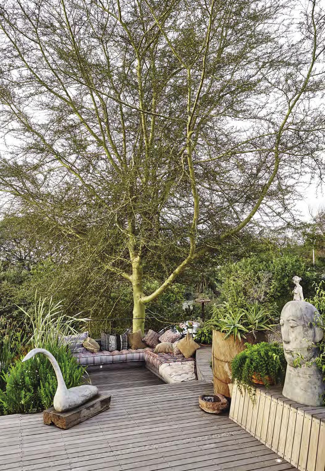 Christine has kept to a neutral palette, occasionally bringing out blue, green and pink found in the glass beads and other objects. There’s a coffee table made from railways sleepers (opposite page), their first acquisition together more than 30 years ago.