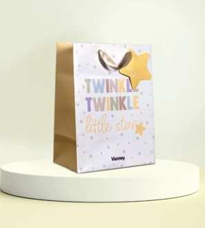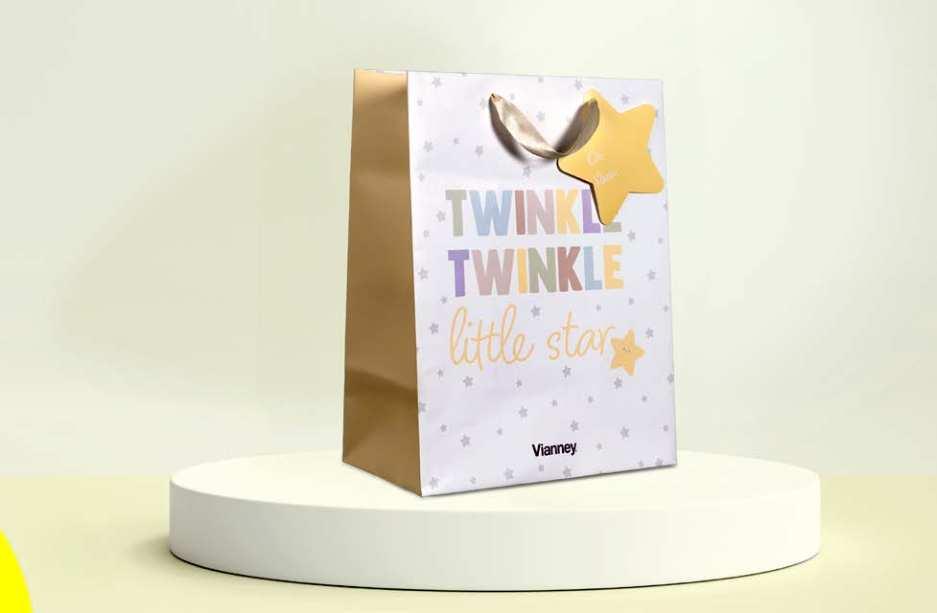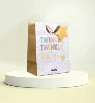 Cardboard bags with ribbon handles. Gift bag design may vary. Subject to availability.