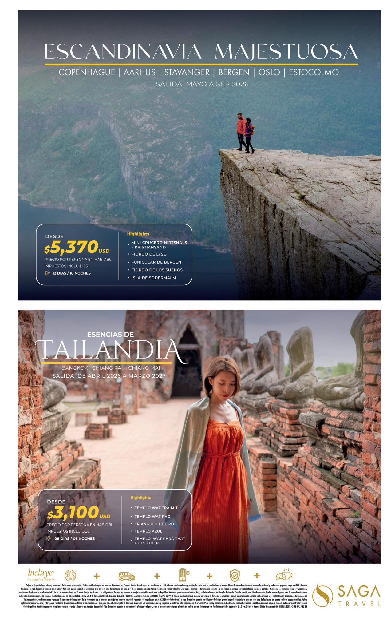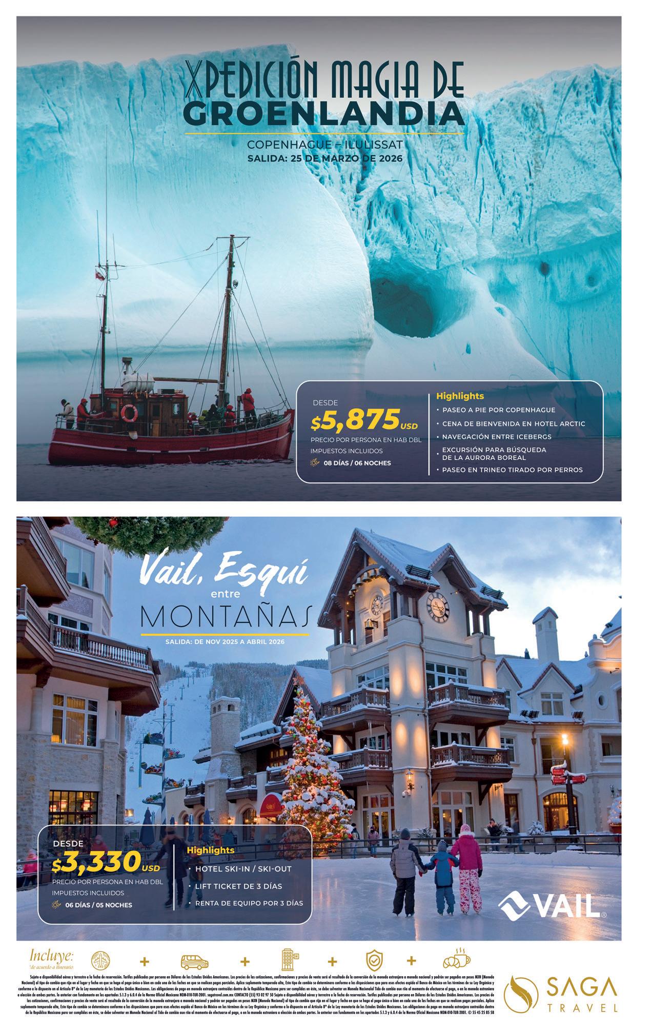 Los países nórdicos: Dinamarca, Noruega, Suecia, Finlandia e Islandia son una sinfonía de naturaleza, historia y elegancia. Y Xperiencia Boreal es una colección de viajes creados por Saga Travel para vivir el alma del norte en estos increíbles destinos. VIDALTURISMO, ESTRATEGIA INFORMATIVA PARA EL VIAJERO. REVISTA MENSUAL, EDICIÓN DE OCTUBRE DEL AÑO 2025. No 162. CIRCULACIÓN GRATUITA, EDITOR RESPONSABLE DANIEL GUERRERO VIDAL. EL CONTENIDO DE SUS ARTICULOS ES RESPONSABILIDAD DE SUS AUTORES Y ANUNCIANTES. DERECHOS RESERVADOS. NÚMERO DE CERTIFICADO DE RESERVA DE DERECHOS AL USO EXCLUSIVO OTORGADO POR EL INSTITUTO NACIONAL DEL DERECHO DE AUTOR 04-2022-081212370900-102. NÚMERO DE CERTIFICADO DE LICITUD Y CONTENIDO: 17566. REGISTRO DE MARCA 1671100 DOMICILIO DE PUBLICACIÓN Y DISTRIBUIDOR CALLE CARNERO 3447 C.P.
