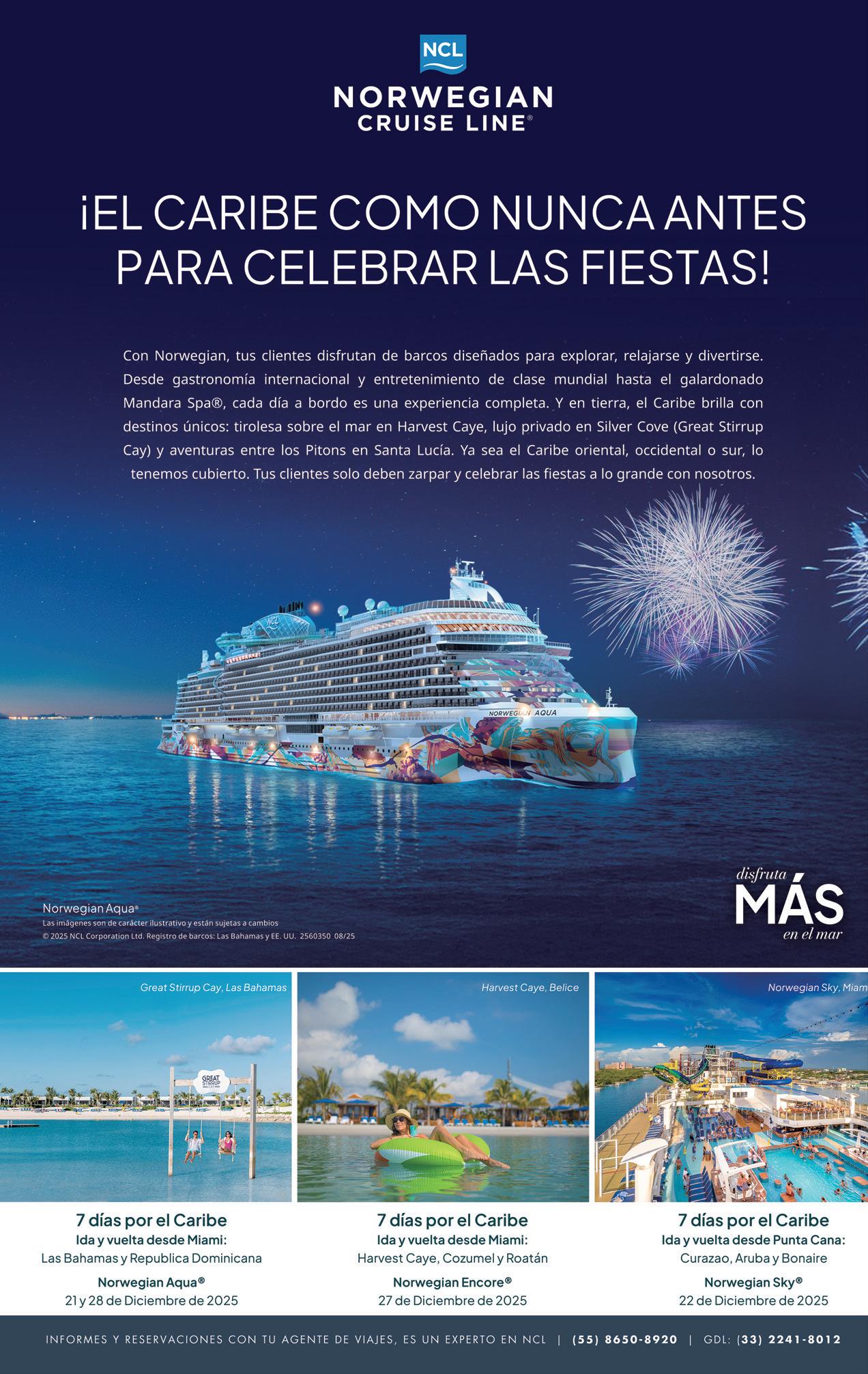 Norwegian Cruise Line (NCL) celebra la llegada de su nuevo barco, Norwegian Aqua™, a Miami para una temporada extendida de cruceros por el Caribe hasta abril de 2026. El Norwegian Aqua realizará itinerarios de siete días desde Miami, visitando destinos como Puerto Plata (República Dominicana), Santo Tomás (Islas Vírgenes de EE. UU.), Tórtola (Islas Vírgenes Británicas) y la exclusiva isla privada de la compañía, Great Stirrup Cay.