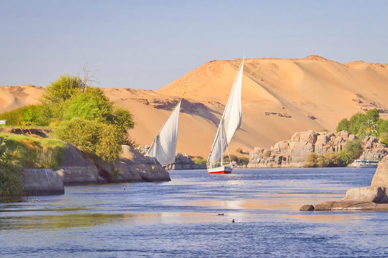 ban colmillos y lomos de elefantes. El viento sopla la vela, los manglares de papiro susurran, y por un minuto el Nilo parecería intacto desde tiempos de ancestrales.