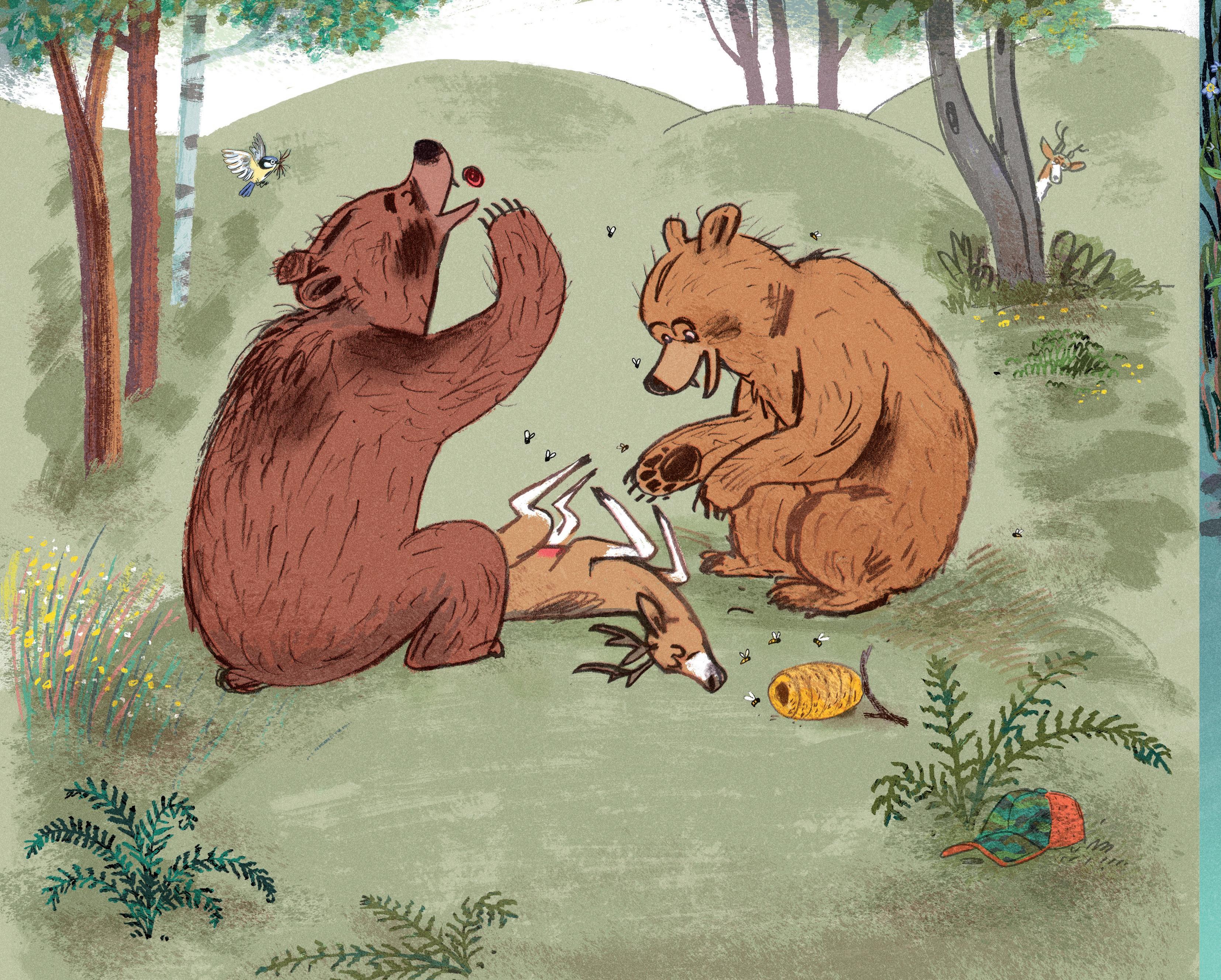 Når herr og fru Brun ikke spiste insekter, beitet de urter og gress, og en varm sommerdag kjente herr Brun den deilige duften av et dødt rådyr. Det ble et riktig festmåltid. Til dessert delte de litt