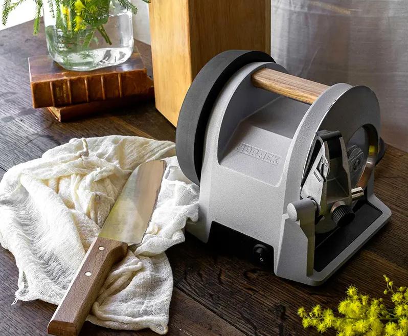Tormek T-1 Kitchen Knife Sharpener slipar hela knivens slipfas, inte bara eggen, vilket ger professionell skärpa på en minut. Den är perfekt för hemmabruk. För kommersiella kök finns Tormek T-2 Pro Kitchen Knife Sharpener.
