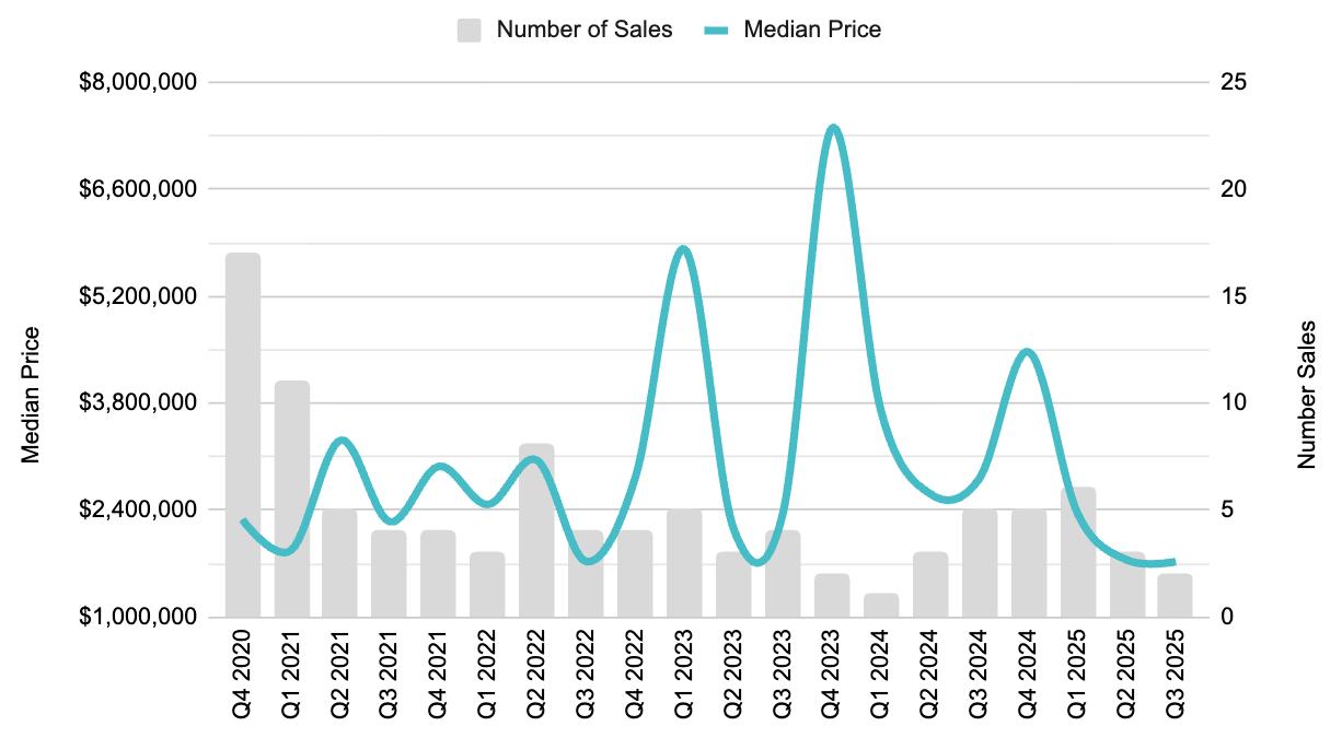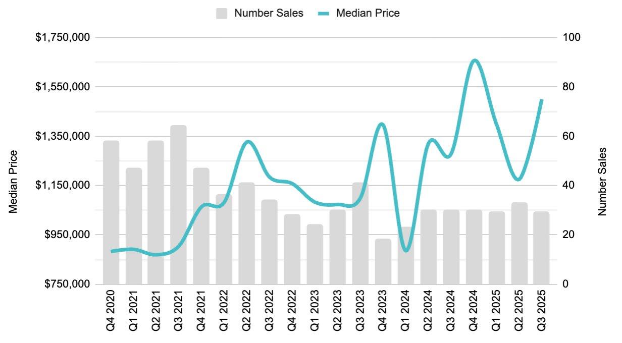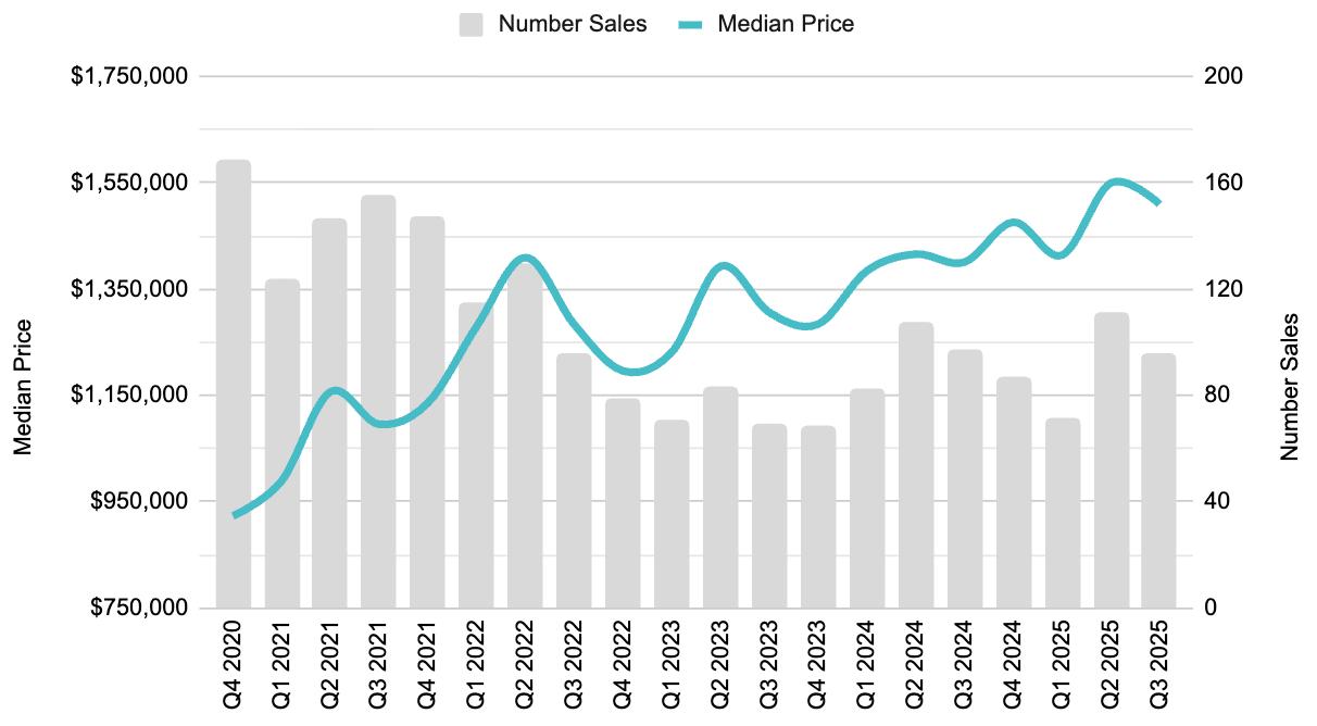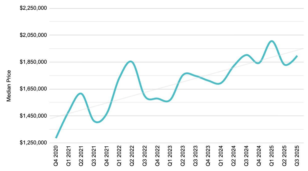 Generally speaking, Q3 2024 is a strong quarter to compare. In Q3 2025, Inventory, Sales, and Months of Supply were up year-over-year, indicating a healthier and more balanced market than we’ve seen over the past few years. In pricing, we saw a near term peak in Q1 2025 at $2MM, a breather in Q2 likely as a result of macro uncertainty (to $1.83MM), and a bounce back in Q3 to just under $1.9MM which is flat compared to Q3 2024. We view these dynamics as healthy when you consider strong annual price appreciation over the past five years, interest rates projected to decline, and macro uncertainty potentially fading into Q4.